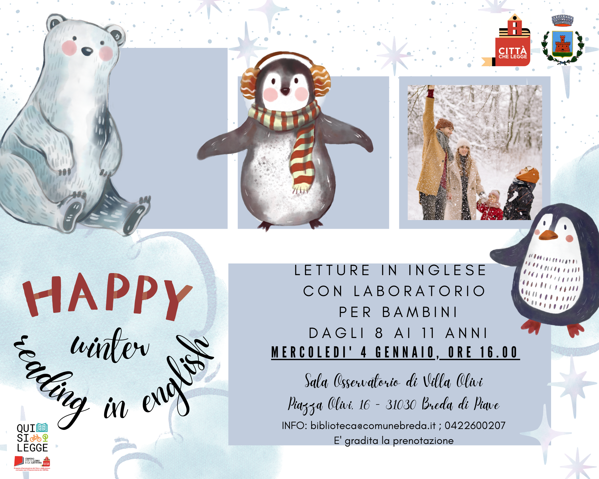 Il 4 gennaio, alle 16, in Villa Olivi le Staffette della lettura del Comune di Breda regaleranno ai ragazzi tra gli 8 e gli 11 anni una lettura in inglese con laboratorio!