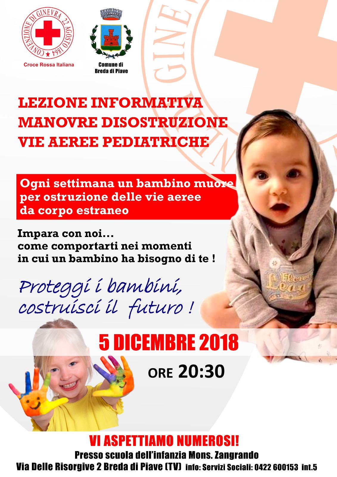 Il Comune di Breda di Piave in collaborazione con Croce Rossa Italiana, nell'ambito del girotondo delle mamme, organizza mercoledì 5 dicembre 2018 alle ore 20.30 presso la scuola dell'infanzia Mons. Zangrando una lezione informativa sulle manovre di disostruzione delle vie aeree pediatriche.