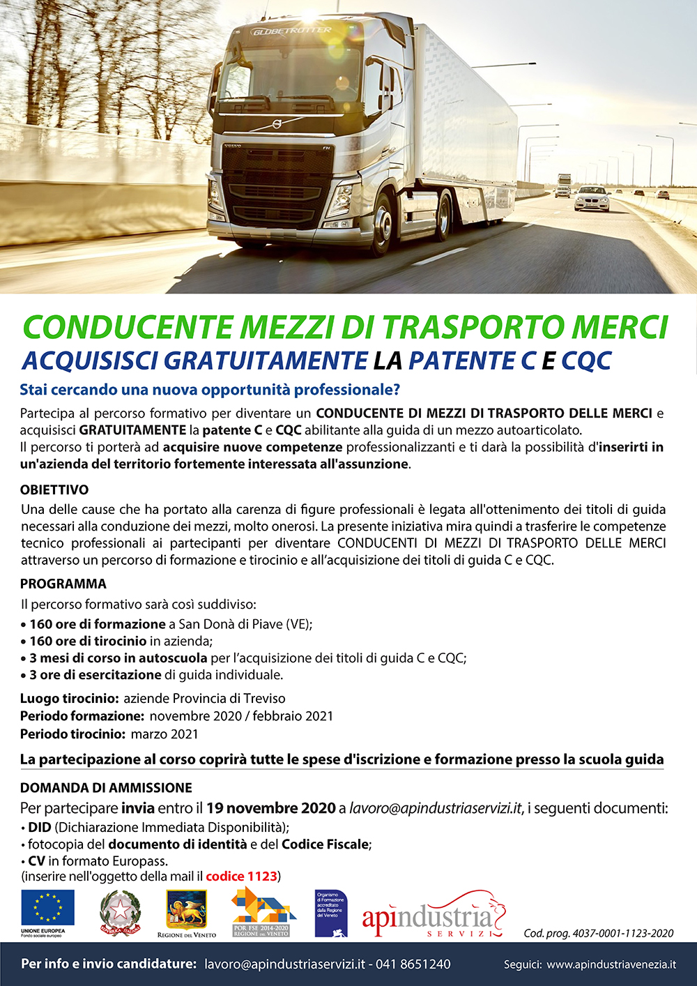 Partecipa al percorso formativo per diventare un CONDUCENTE DI MEZZI DI TRASPORTO DELLE MERCI e acquisisci GRATUITAMENTE la patente C e CQC abilitante alla guida di un mezzo autoarticolato.