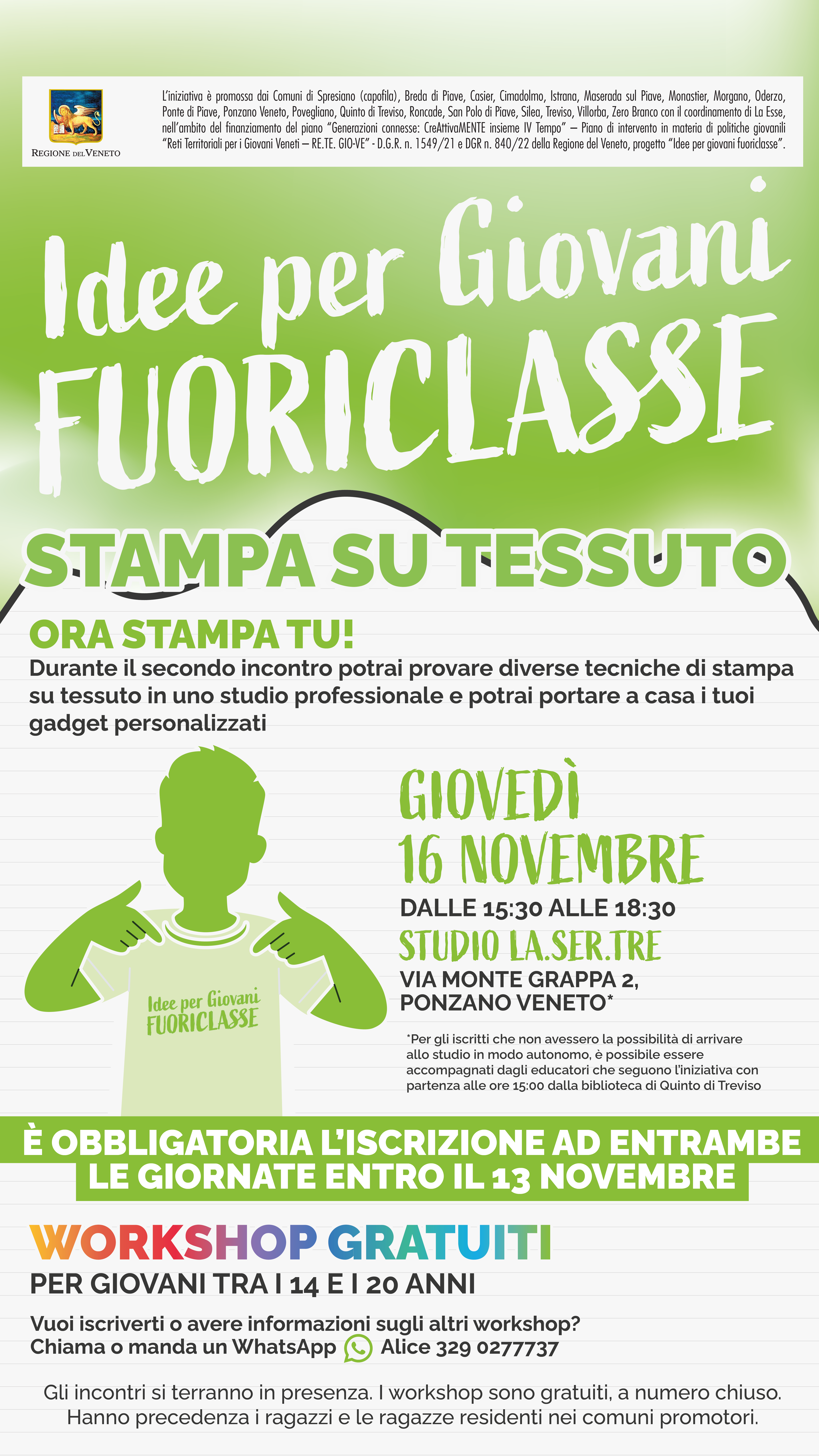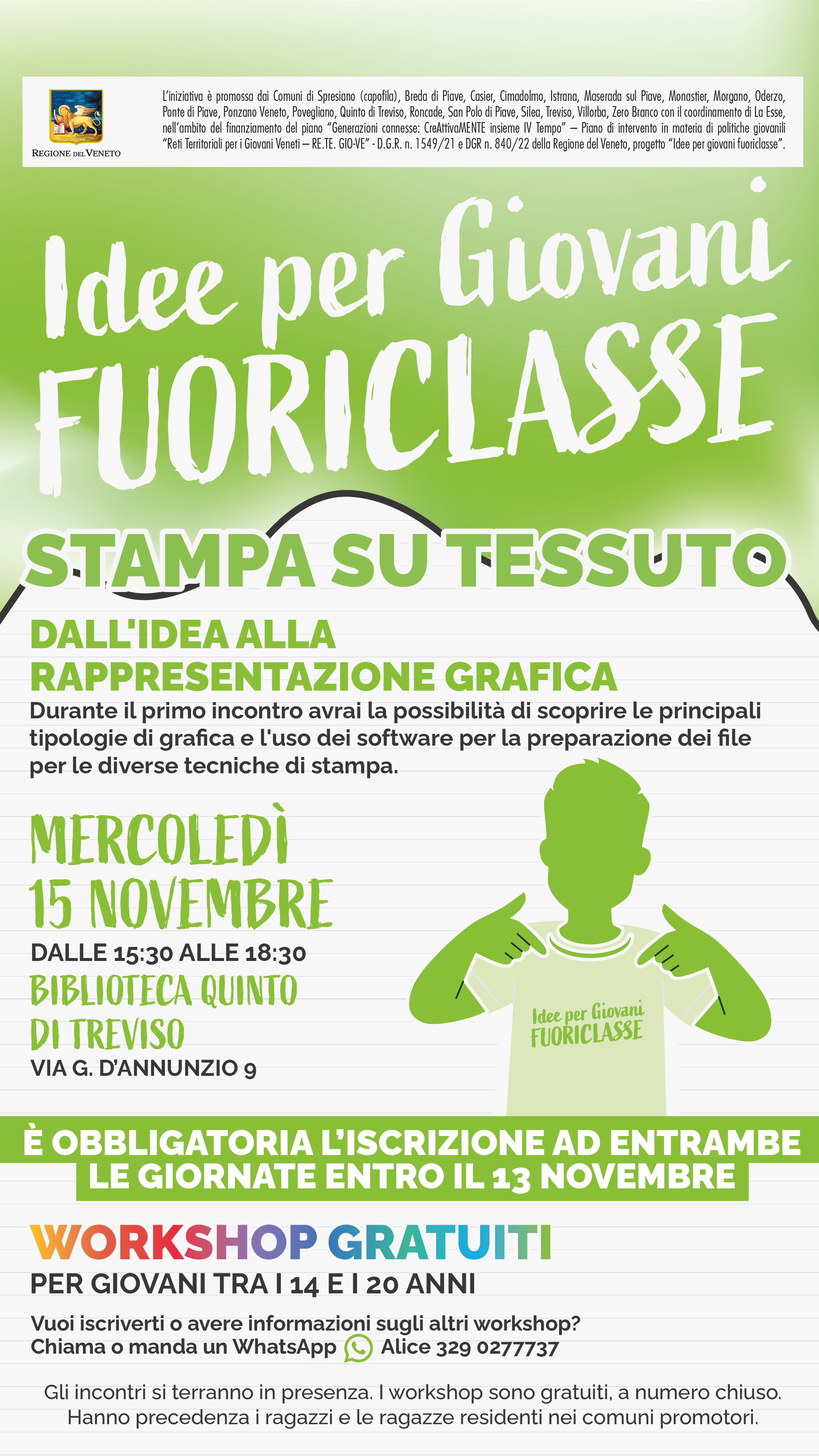 L’iniziativa è promossa dai Comuni di Spresiano (capofila), Breda di Piave, Casier, Cimadolmo, Istrana, Maserada sul Piave, Monastier, Morgano, Oderzo, Ponte di Piave, Ponzano Veneto, Povegliano, Quinto di Treviso, Roncade, San Polo di Piave, Silea, Treviso, Villorba, Zero Branco con il coordinamento di La Esse, nell’ambito del finanziamento del piano “Generazioni connesse: CreAttivaMENTE insieme IV Tempo” – Piano di intervento in materia di politiche giovanili “Reti Territoriali per i Giovani Veneti – RE.TE. GIO-VE” - D.G.R. n. 1549/21 e DGR n. 840/22 della Regione del Veneto, progetto “Idee per giovani fuoriclasse”.