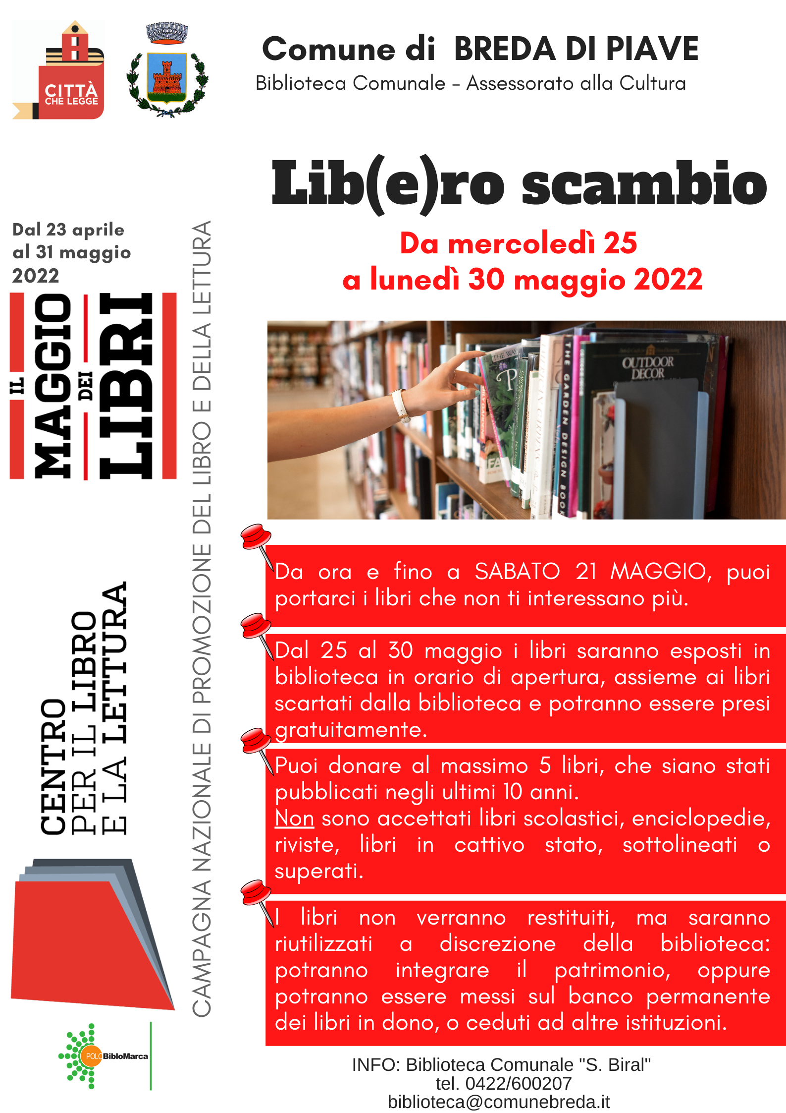 La biblioteca comunale di Breda partecipa anche quest'anno alla rassegna nazionale "Il maggio dei libri" con l'iniziativa Lib(e)ro scambio di libri.