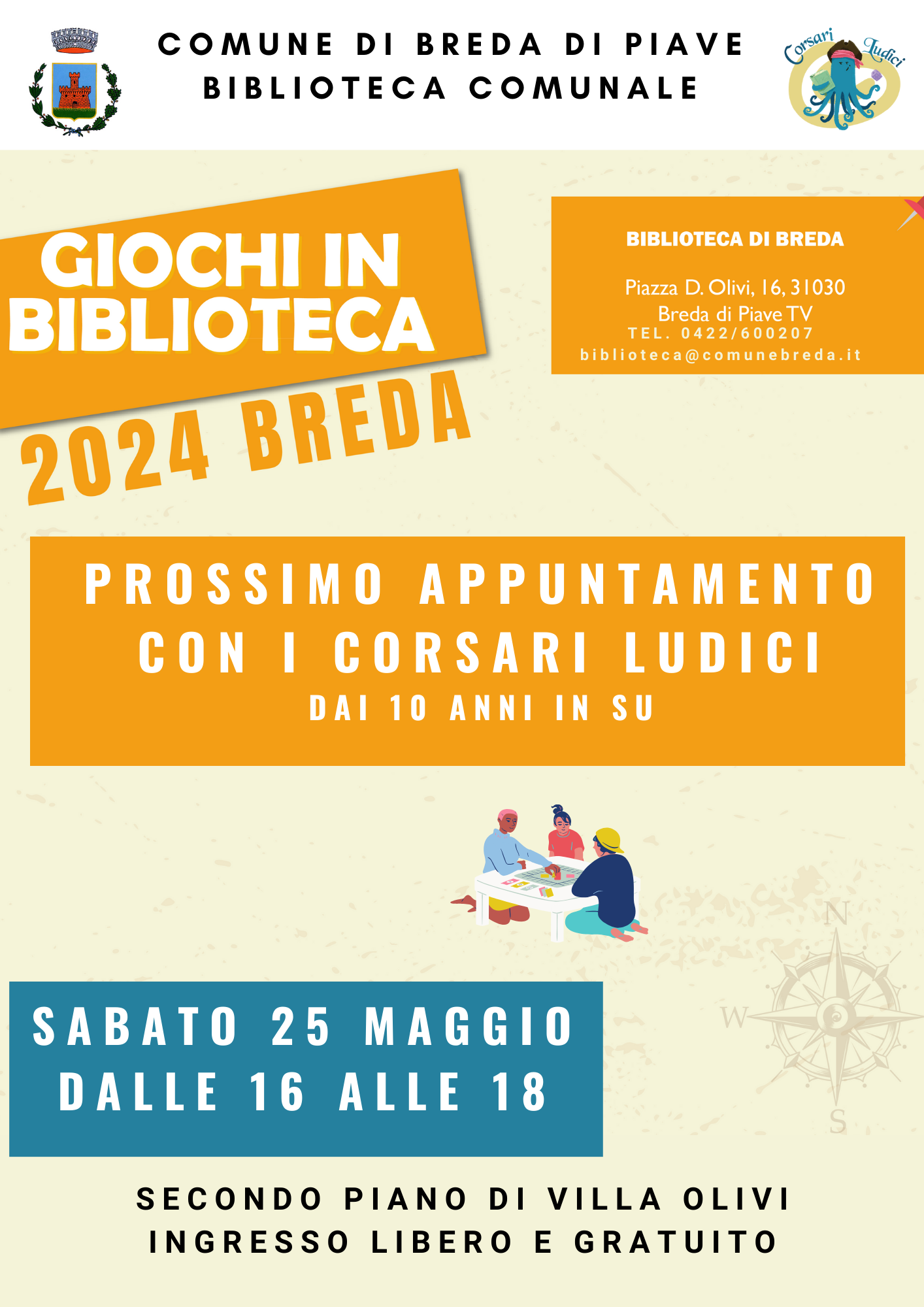 La biblioteca di Breda ricorda il prossimo appuntamento con i Corsari ludici e i giochi in scatola, dai 10 anni in su, previsto per sabato 25 maggio dalle 16 al secondo piano di Villa Olivi (sopra la biblioteca comunale).