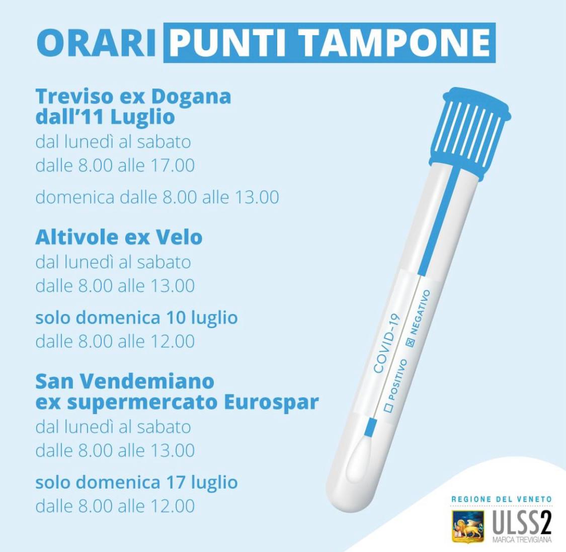 Si ricorda che per effettuare il tampone è sempre necessaria la prenotazione: può essere effettuata online tramite il sito web dell’Ulss 2 (https://www.aulss2.veneto.it/tamponi) o telefonicamente, contattando il call center al numero 0422 210701.