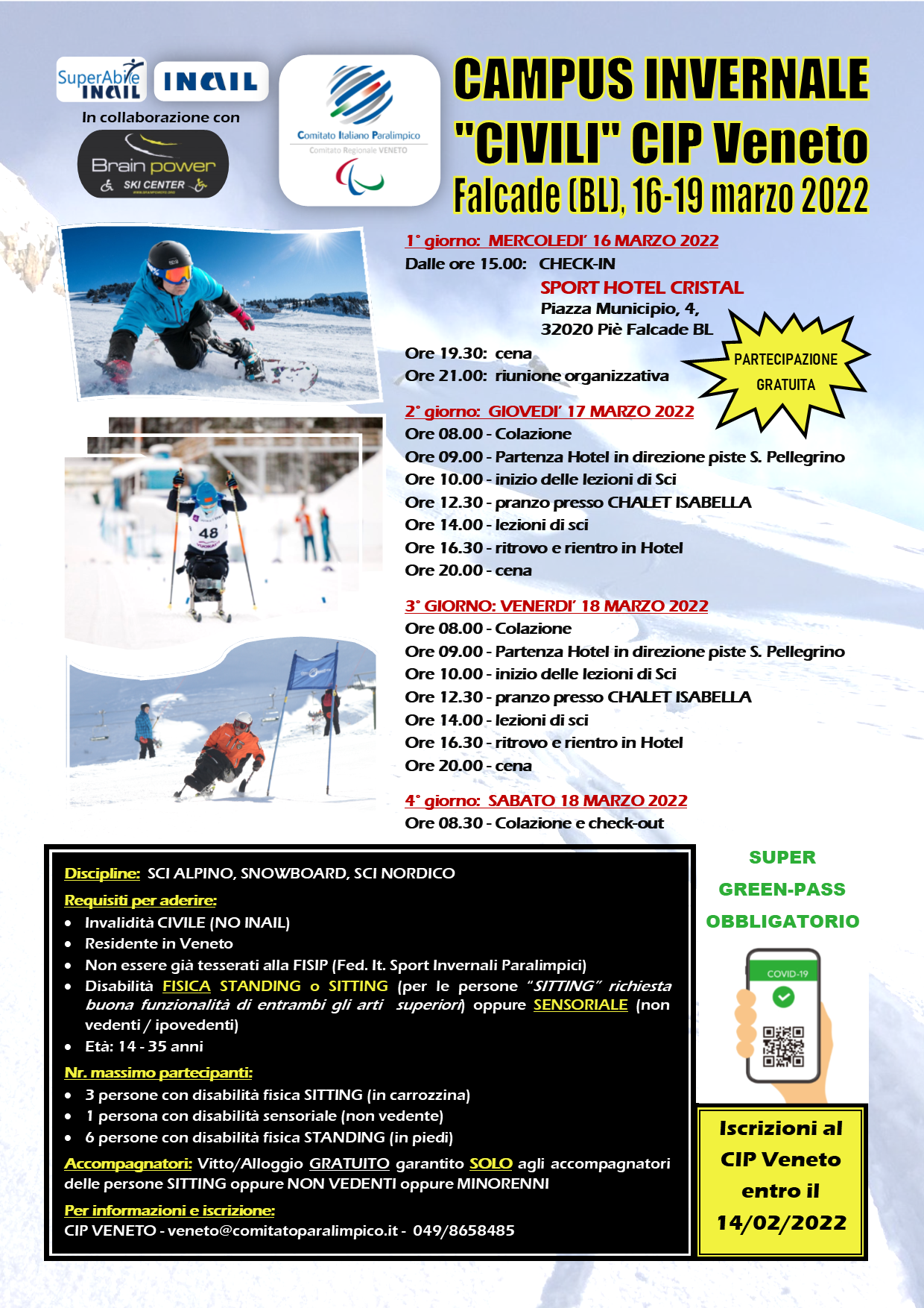 il CIP Veneto, nell'intento di avvicinare nuovi atleti alle discipline invernali, ha deciso di organizzare il "CAMPUS INVERNALE CIVILI - CIP VENETO", rivolto a 10 persone disabili con una invalidità civile residenti in Veneto.