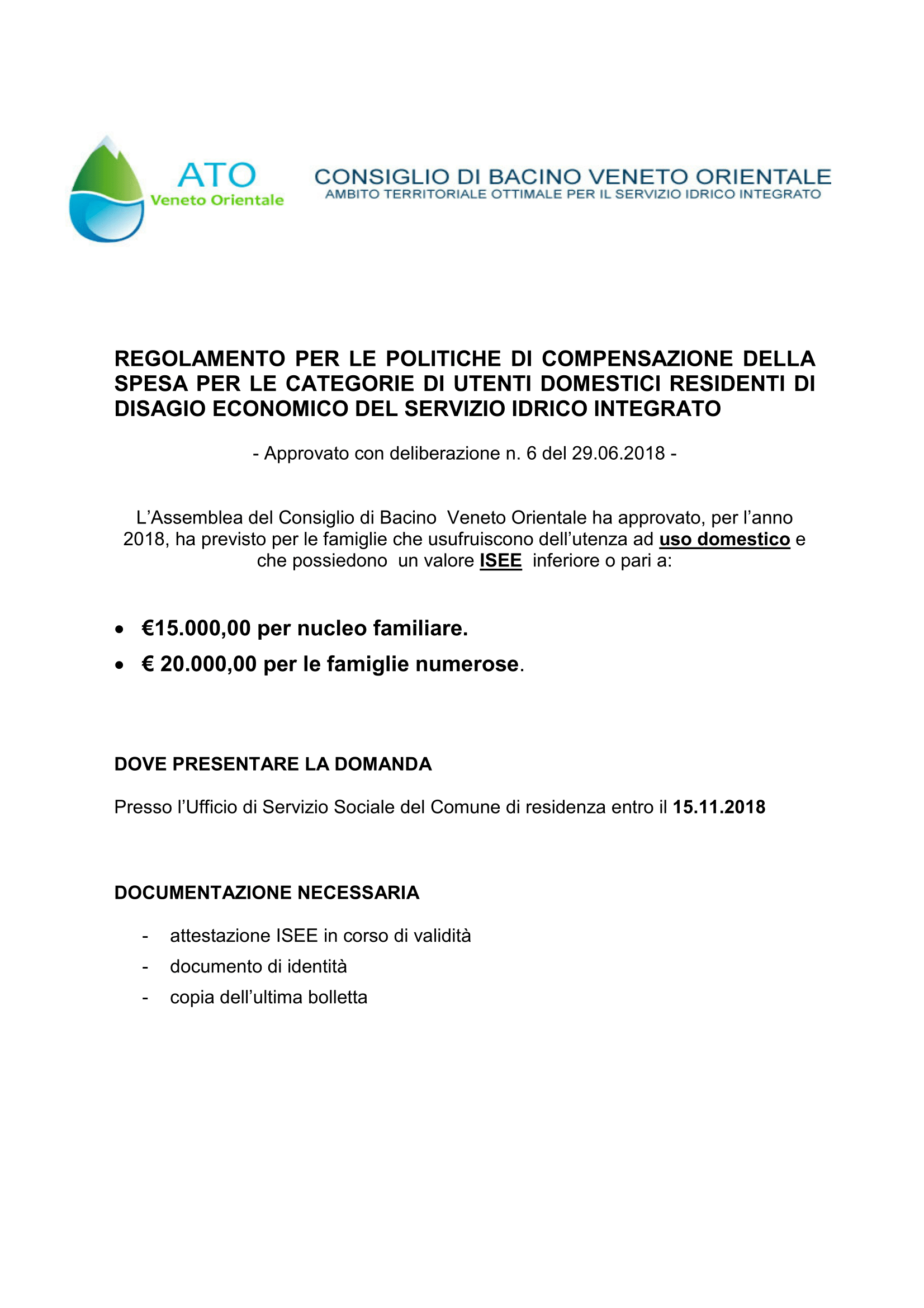 Il Consiglio di Bacino Veneto Orientale - Servizio Idrico Integrato ha deliberato con proprio provvedimento n. 6/2018 di stabilire per l'anno 2018 un valore ISEE pari ad Euro 15.000,00.= per nucleo familiare ed Euro 20.000,00 per le famiglie numerose per poter ricevere il Bonus Acqua.