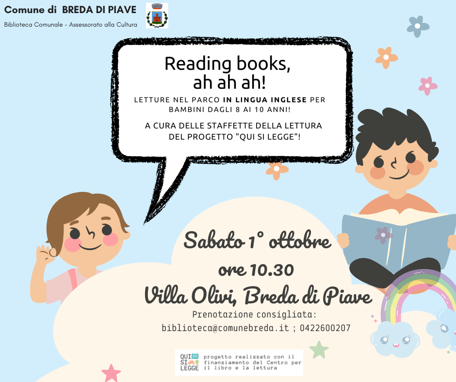 Alcune Staffette della Lettura della Biblioteca Comunale, che nei mesi scorsi hanno condotto, nell'ambito del progetto "Qui si legge", la nostra cargo bike in vari punti del territorio comunale, sabato 1° ottobre, alle 10.30, offriranno ai bambini dagli 8 ai 10 anni delle letture in lingua inglese, nel Parco adiacente la Biblioteca.