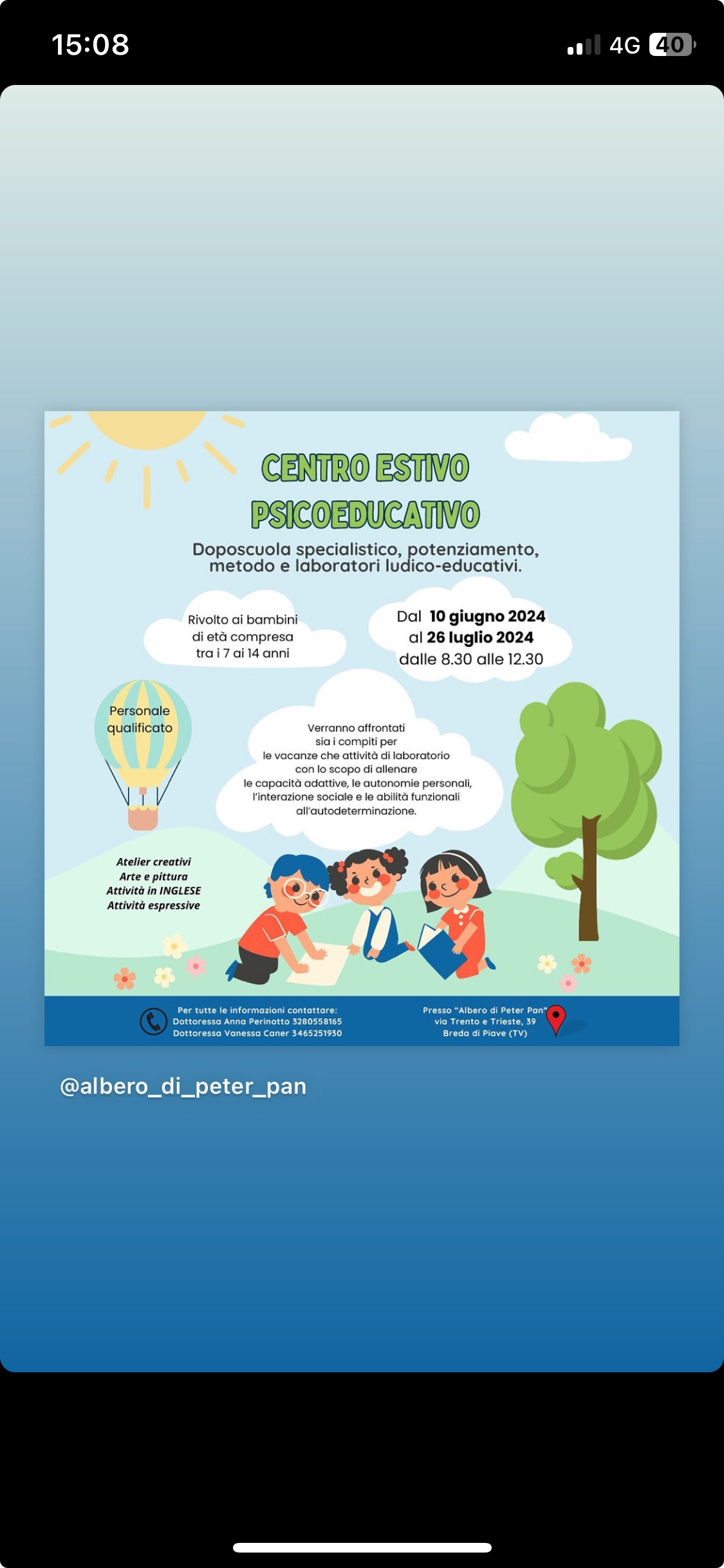 10 giugno-26 luglio Albero di Peter Pan Via Trento e Trieste a Breda 8.30-12.30 7-14 anni doposcuola specialistico, laboratori ludico-ricreativi depliant informativo
