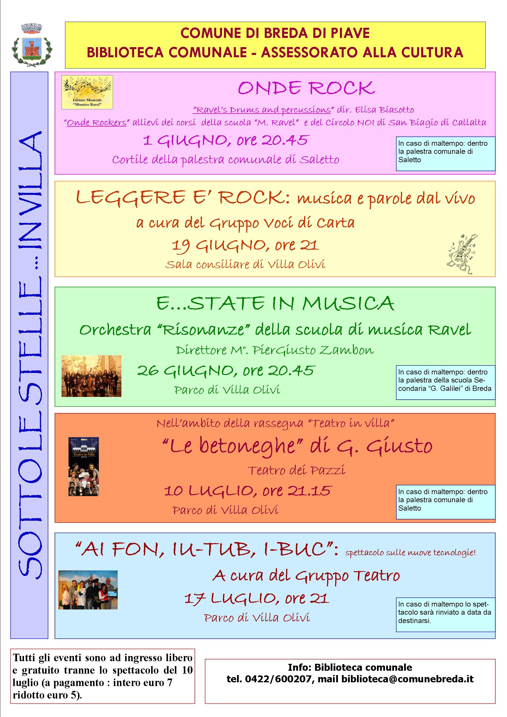 lunedì 1 giugno Aprirà la rassegna il concerto “Onde Rock”, in collaborazione con la Scuola M. Ravel, che si terrà alle ore 20.45 presso la sala polivalente Villa del Bosco in via Villa del Bosco a S. Bartolomeo di Breda di Piave. Entrata libera e gratuita.