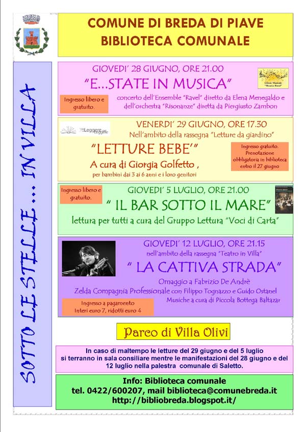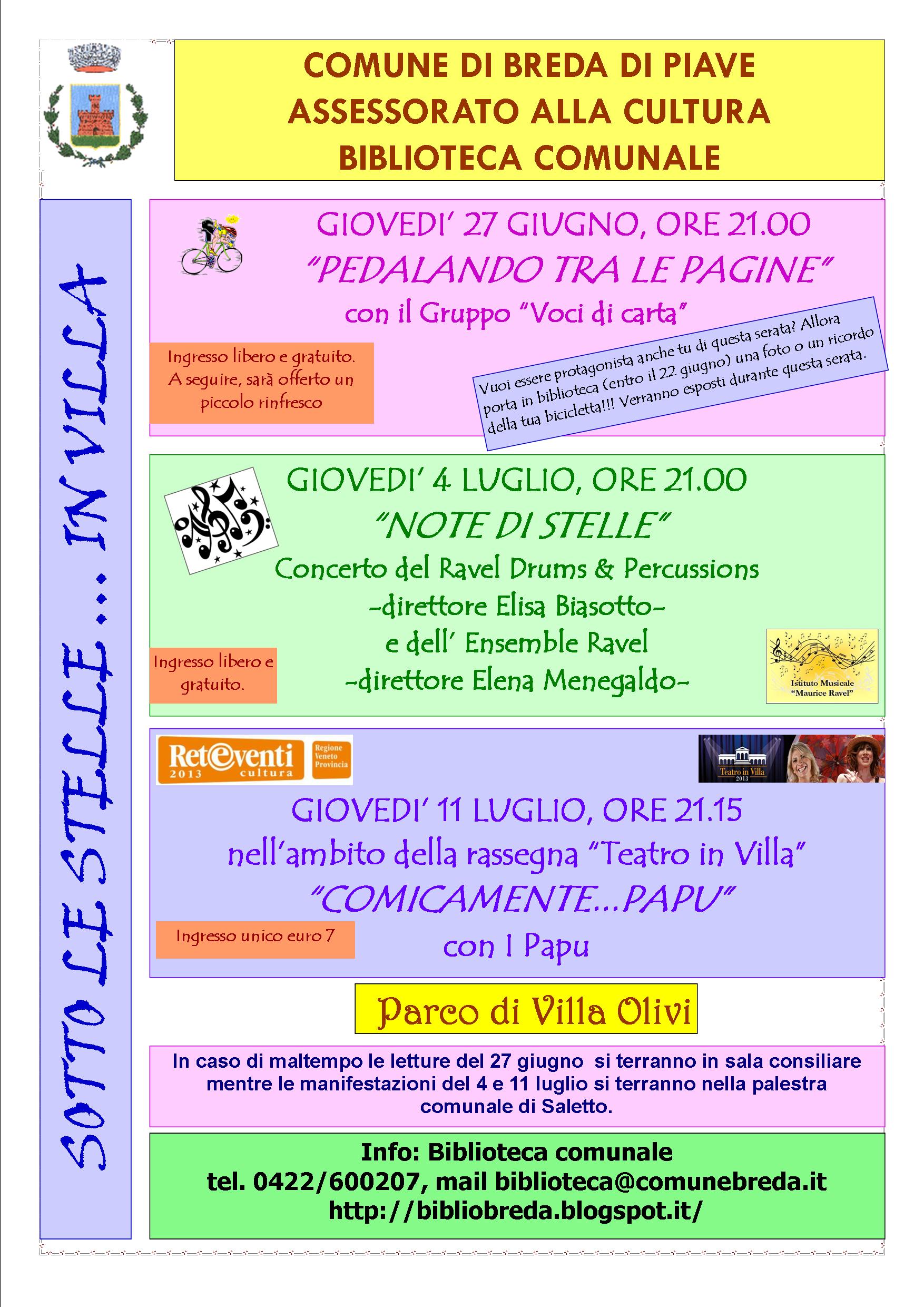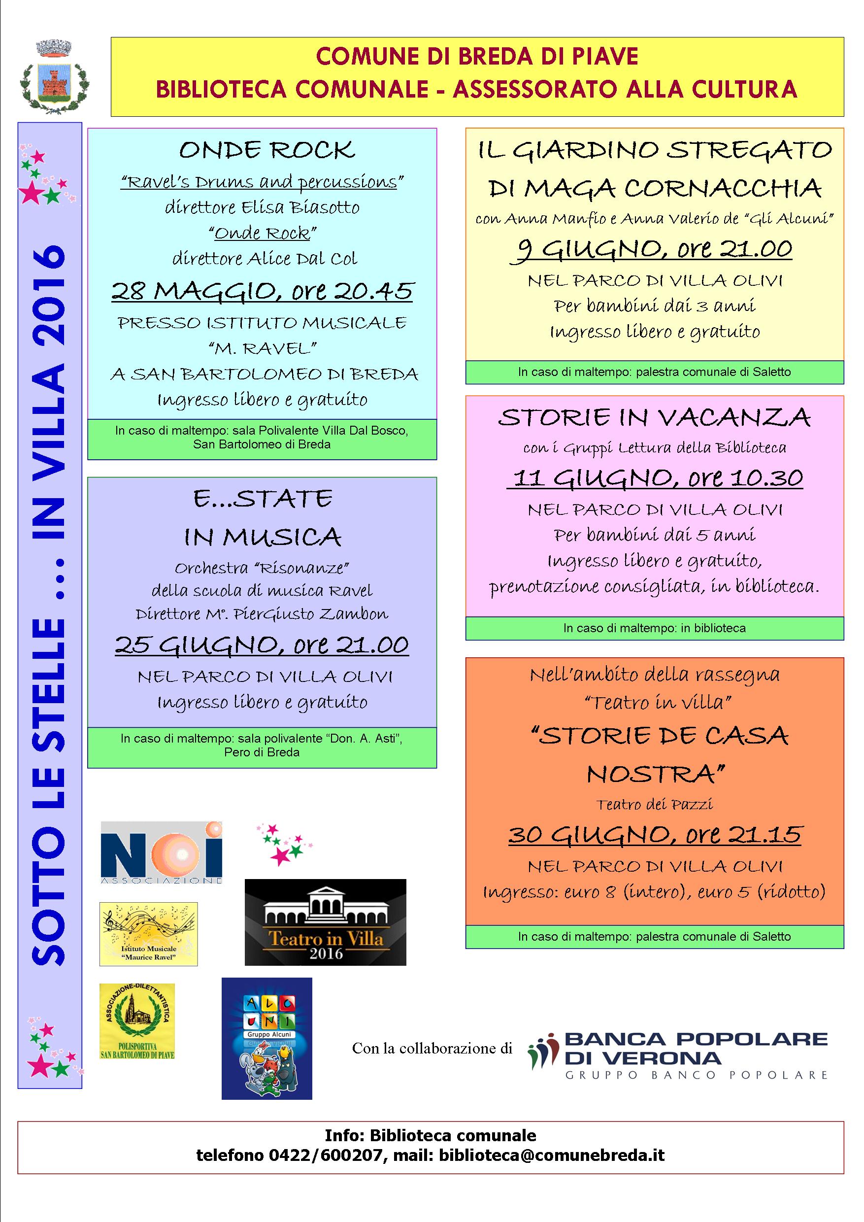 La Biblioteca Comunale “Maestro Sergio Biral” e l' Assessorato alla Cultura organizzano anche quest'anno la rassegna "Sotto le stelle .. in villa": un panorama di eventi ricco di concerti e spettacoli teatrali, con in più la novità di uno spettacolo pensato appositamente per i più piccoli.