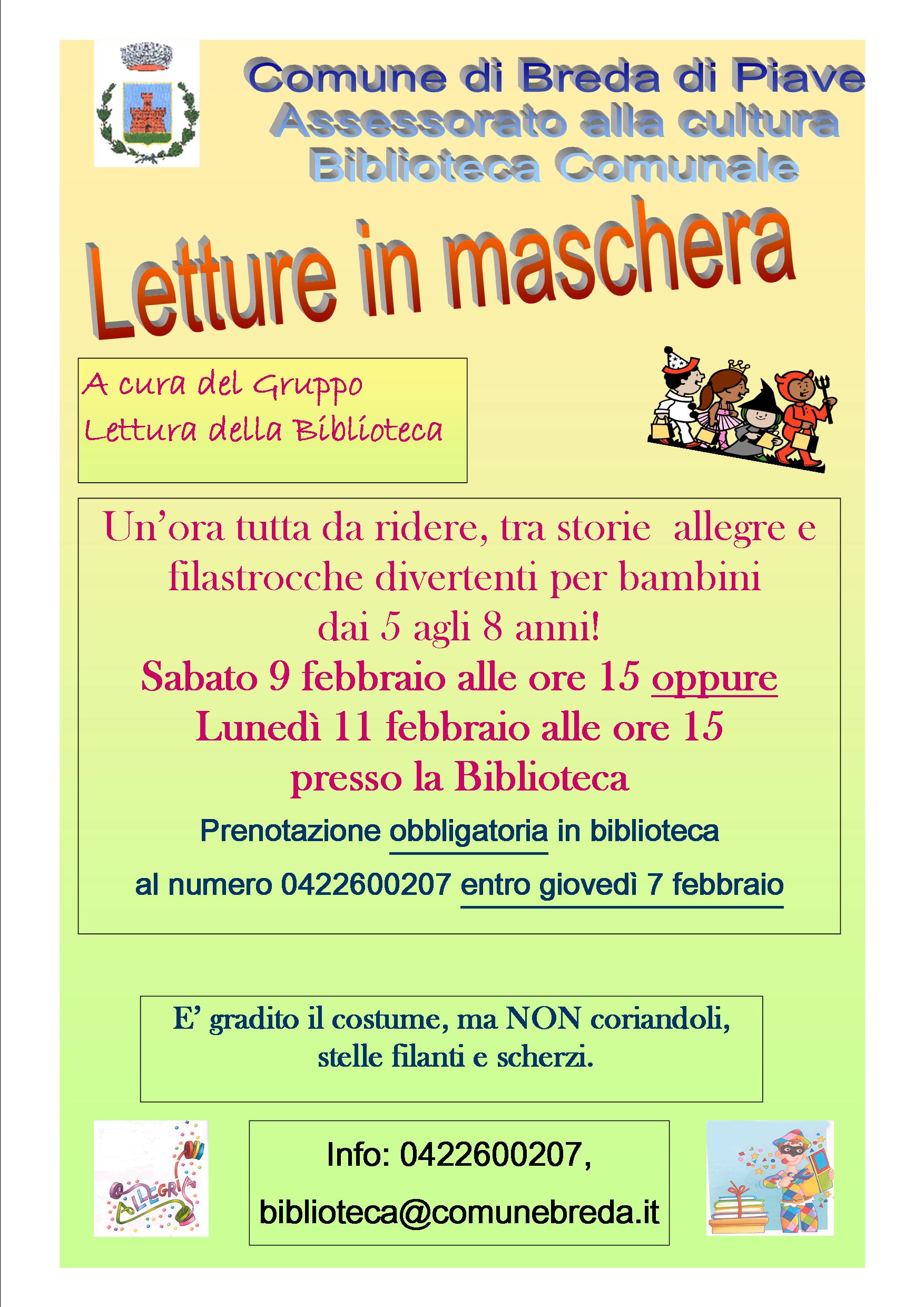 Nel pomeriggio del lunedì grasso, 8 febbraio, il Gruppo Lettura e il Gruppo Giovani lettori hanno proposto letture in maschera, alle quali hanno partecipato una ventina di bambini, poi coinvolti nella costruzione di un semplice gioco.