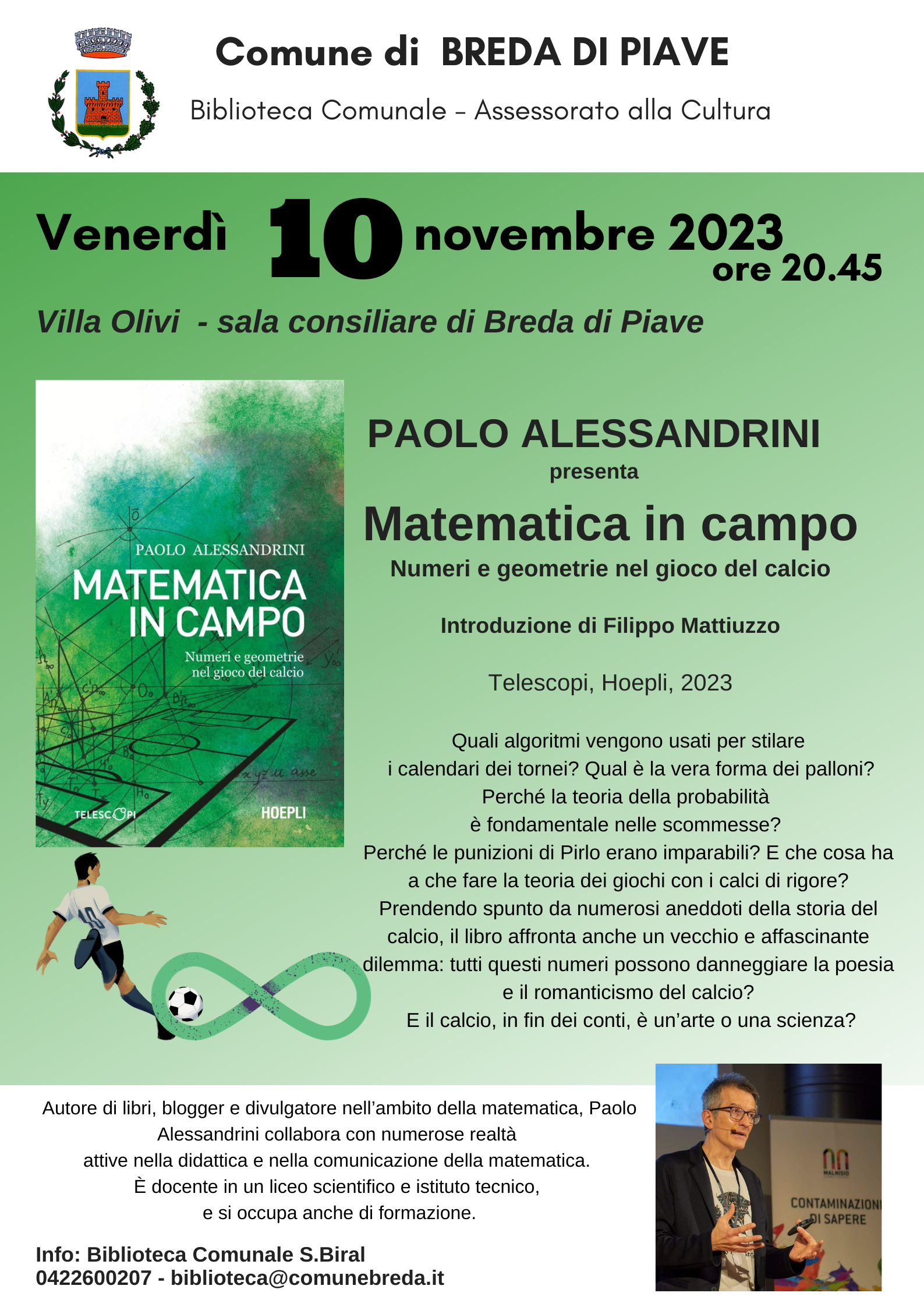 Paolo Alessandrini, autore locale che scrive per la casa editrice Hoepli, blogger e docente, il 10 novembre, alle 20.45, presenterà in sala consiliare (Villa Olivi) il suo terzo libro “Matematica in campo”, uscito il 13 ottobre scorso. Introdotto da Filippo Mattiuzzo, metterà insieme due ambiti apparentemente distanti, senza togliere bellezza a uno degli sport più praticati ed amati al mondo, e regalando la possibilità di far pace con una materia ostica per molti. Ingresso libero e gratuito.