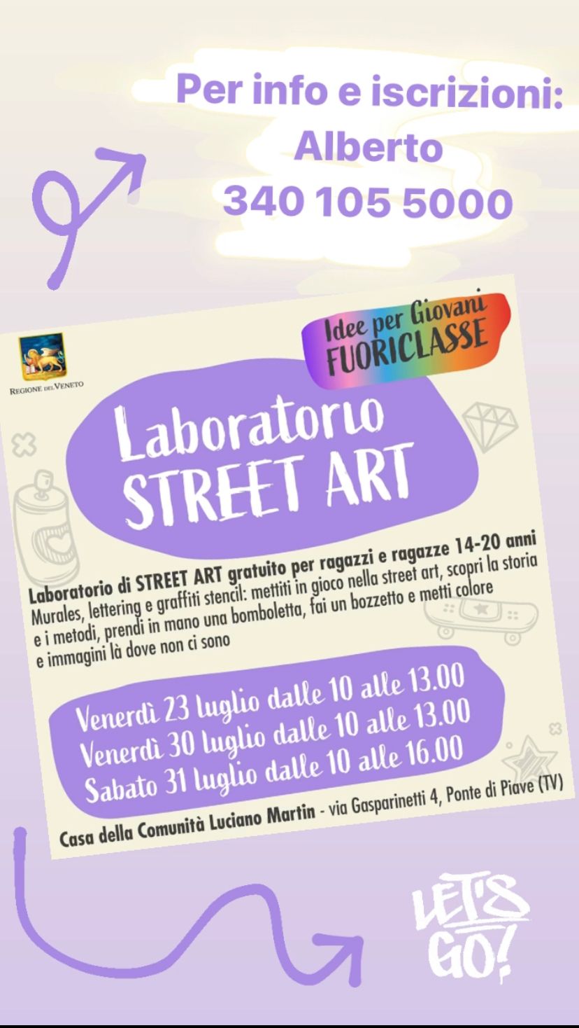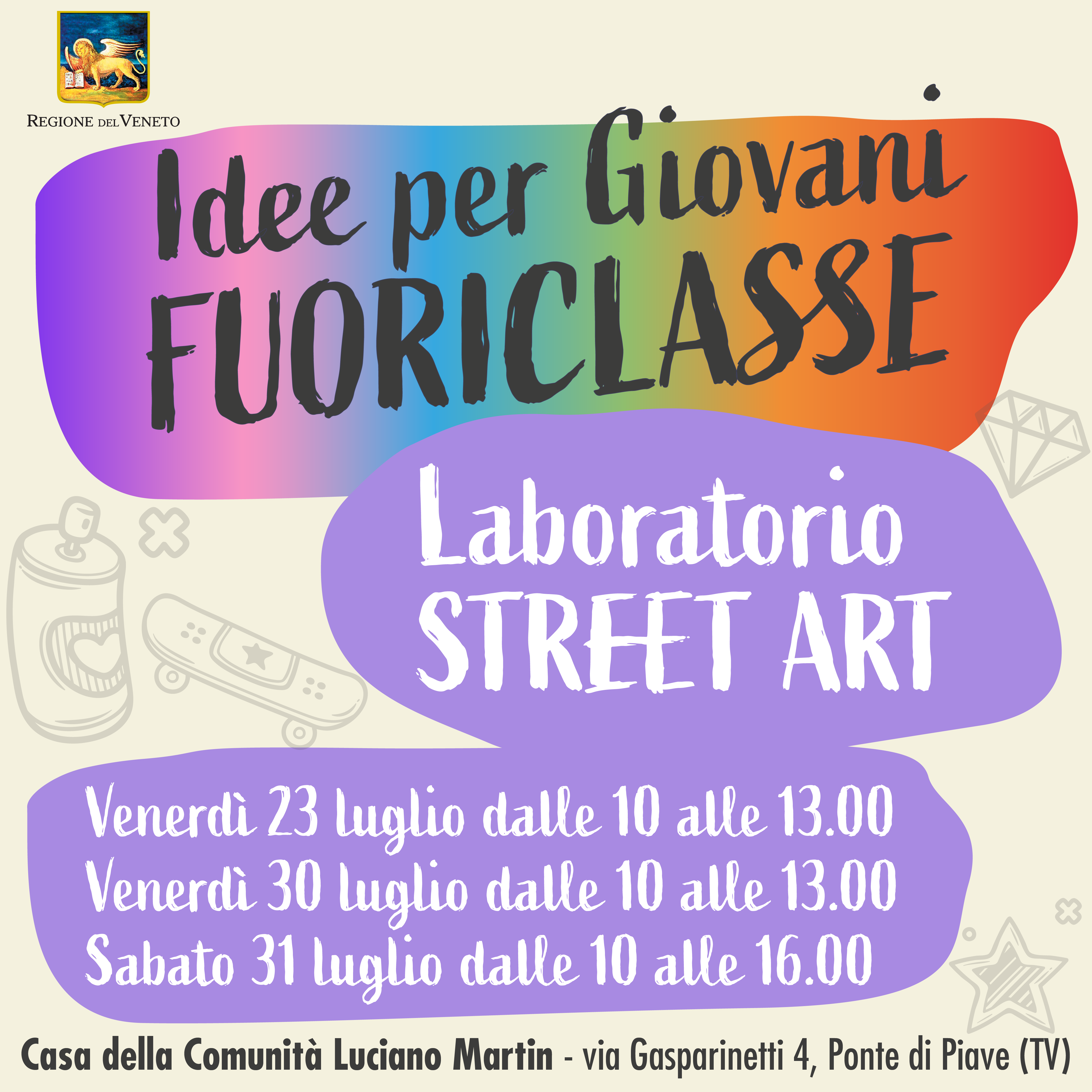 - A Ponte di Piave, si terrà in presenza. Murales, lettering, graffiti stencil, mettiti in gioco nella street art, scopri la storia, i metodi, prendi in mano una bomboletta, fai un bozzetto, e metti colore e immagini là dove non ci sono.