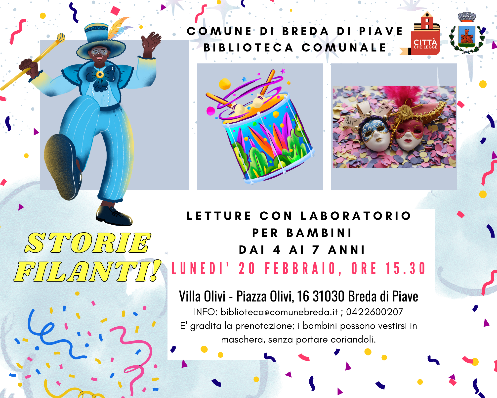 A fine Carnevale, offriremo ai piccoli amanti dei libri un momento di accoglienza e di lettura, con piccolo laboratorio, nella nostra Biblioteca Comunale!