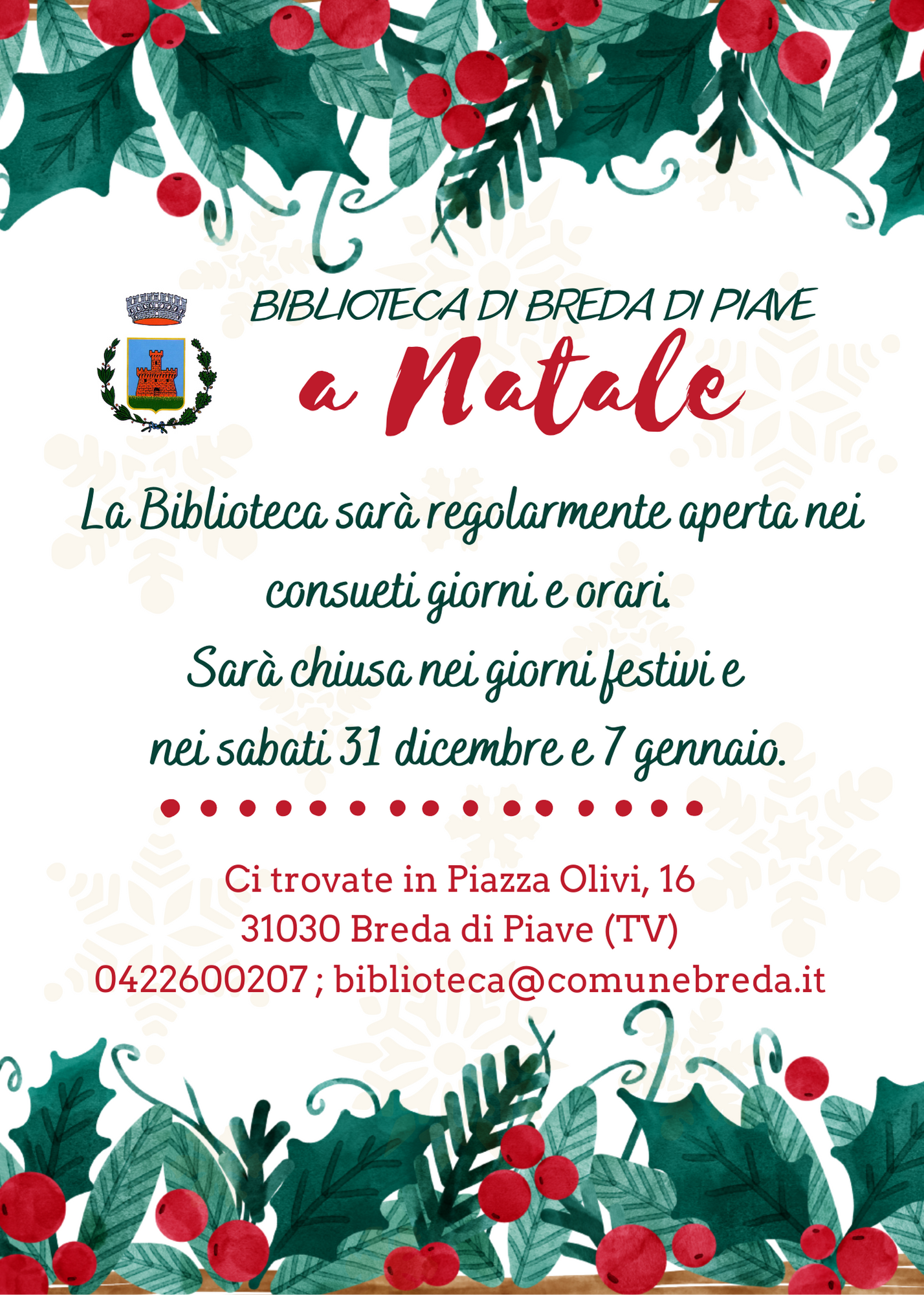La Biblioteca Comunale di Breda sarà regolarmente aperta durante il periodo Natalizio, eccetto nei giorni festivi e nei sabati 31 dicembre e 7 gennaio.