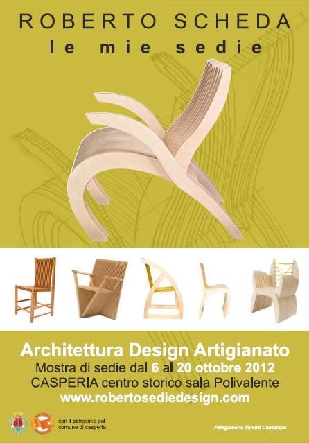 Si inaugura sabato 6 ottobre a Casperia per concludersi il 20 ottobre la mostra dell’architetto Roberto Scheda Le mie sedie. Si tratta di una serie di creazioni realizzate da Scheda in diversi anni di attività prima nel suo laboratorio “Il Nuovo artiginato” di Casperia a metà degli anni Settanta, poi nel laboratorio artigiano di falegnameria Valerio Valenti di Cantalupo in Sabina nel quale vengono realizzati diversi prototipi di sedie. La mostra, un mix di lavori dove il design si coniuga all’artigianato, si tiene nella sala polivalente del comune di Casperia.