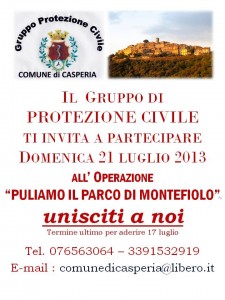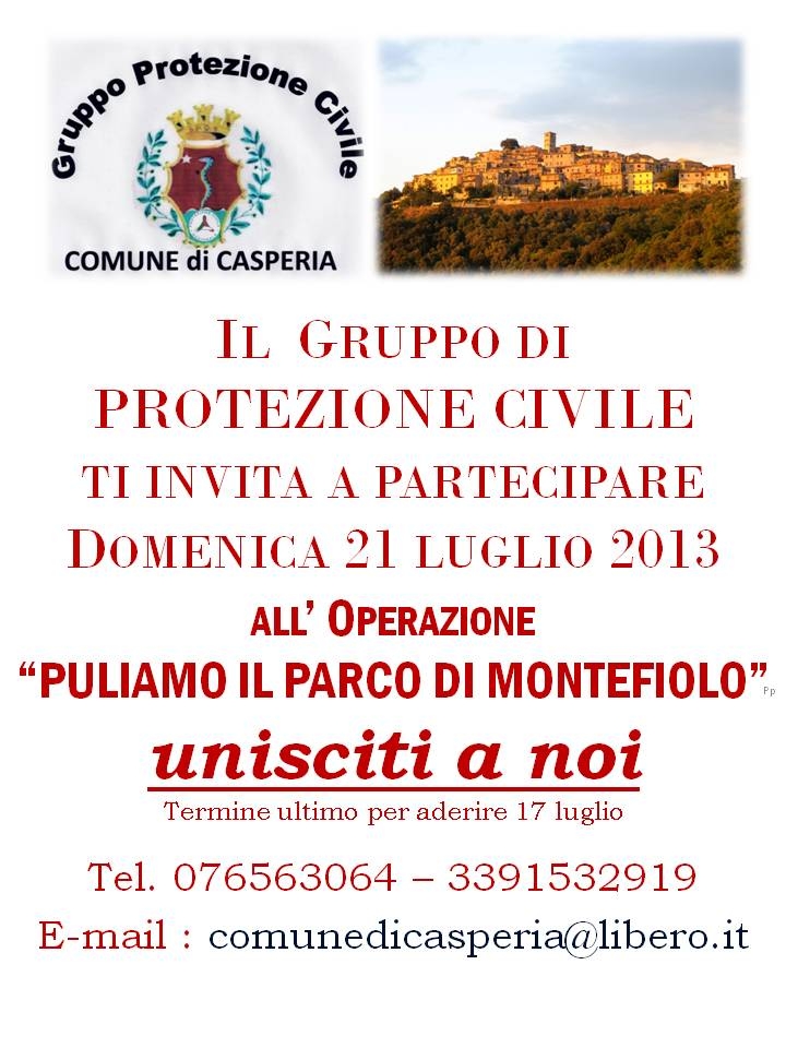Il Gruppo comunale di volontari di Protezione civile ha organizzato una giornata di volontariato per pulire il parco di Montefiolo. Le attività si svolgeranno domenica 21 luglio. Per informazioni e/o adesioni scrivere un’email a comunedicasperia@libero.it o telefonare al numero 339.1532919 (Maura).