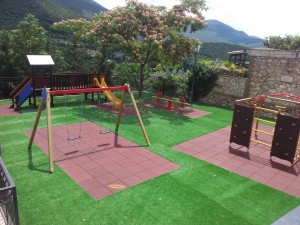 Il nuovo giardino è ora coperto da un tappeto di erba sintetica che ha sostituito il vecchio ghiaino; nelle aree di gioco sono stati installati, invece, dei pannelli di gomma per attutire eventuali cadute. Sono stati installati nuove altalene, un nuovo dondolo ed un blocco dove arrampicarsi. La struttura dello scivolo, invece, è stata restaurata considerato il suo buono stato di conservazione.