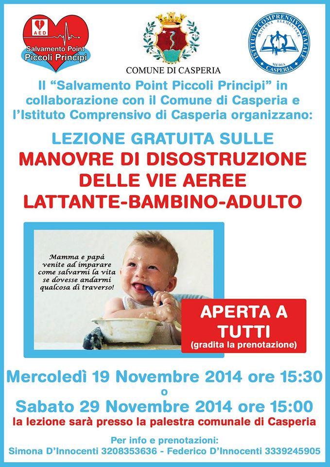 Il Comune di Casperia, in collaborazione con il “Salvamento Point Piccoli Principi ” e l’Istituto comprensivo di Casperia, organizza il corso di disostruzione delle vie aeree con lo scopo di insegnare le manovre anti-soffocamento per disostruire un lattante, un bambino o un adulto nel caso di ostruzione delle vie aeree da corpo estraneo. Il corso, che si terrà il 19 novembre dalle 15,30 e il 29 novembre dalle 15 nella palestra comunale di Casperia, è rivolto a tutti ed è gratuito. Gradita la prenotazione. Per ulteriori informazioni contattare Simona D’Innocenti al numero telefonico 320.8353636 o Federico D’Innocenti al numero 333.9245905.