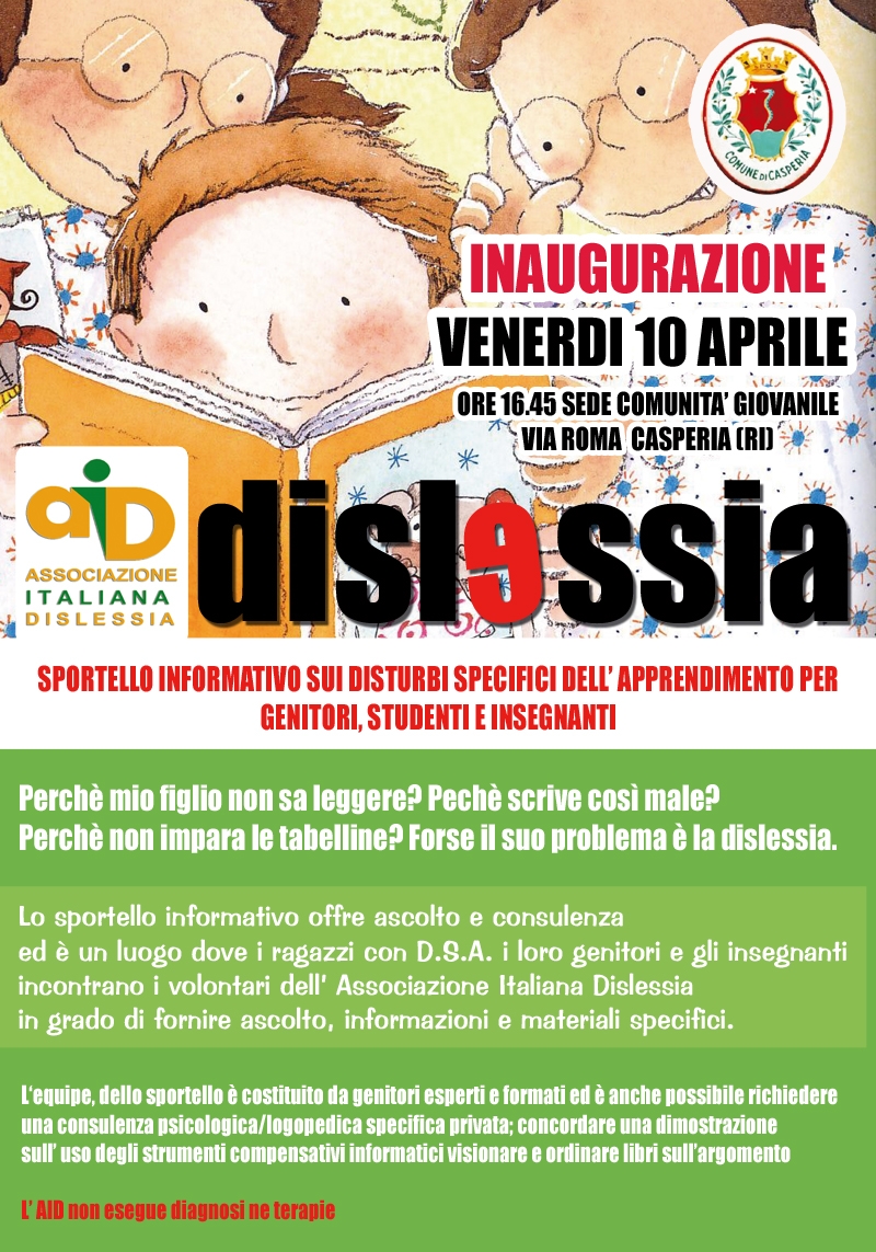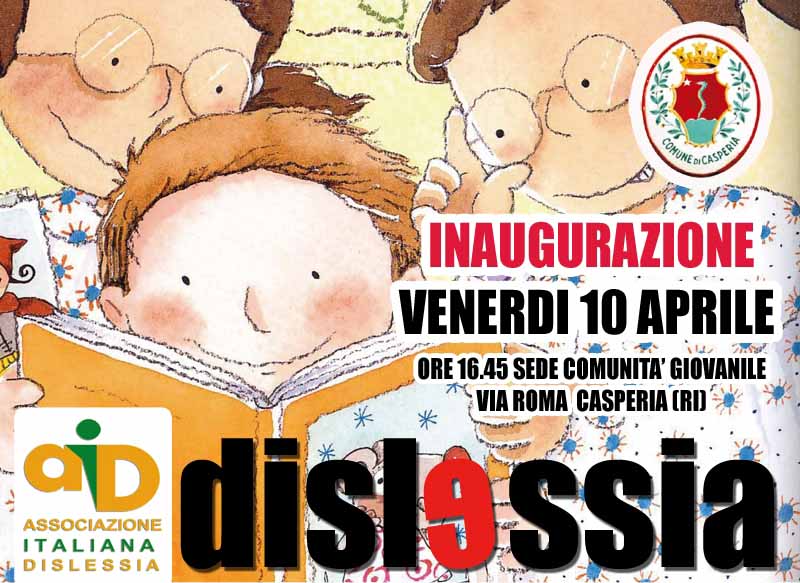 L’Amministrazione comunale di Casperia e l’Associazione italiana Dislessia hanno sottoscritto una convenzione per l’apertura di un nuovo sportello informativo presso la sede della Comunità giovanile (via Roma n. 11), che sarà inaugurato venerdì 10 aprile alle ore 16,45 alla presenza dei volontari della sezione Aid di Rieti e del Gruppo giovani dislessici di Roma.