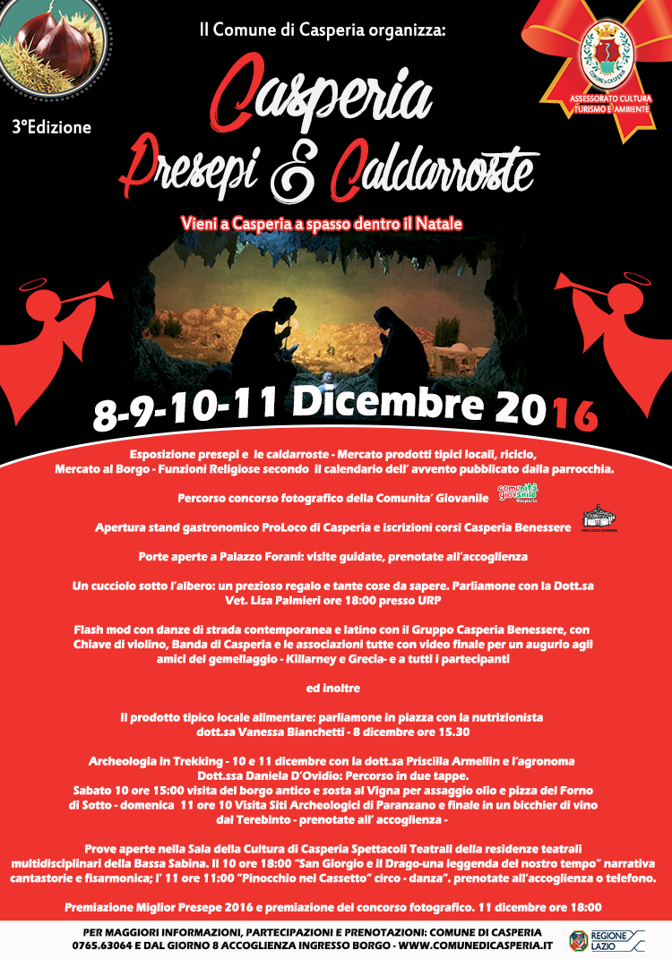 Da giovedì 8 a domenica 11 dicembre, si tiene la terza edizione di Casperia: presepi e caldarroste, la manifestazione promossa dall’assessorato alla Cultura, Turismo e Ambiente per celebrare l’avvio del periodo natalizio valorizzando l’antico borgo con una serie di percorsi culturali. Fulcro dell’iniziativa è, come sempre, il concorso dedicato ai presepi esposti nel centro storico, cui fanno da cornice una miriade di iniziative tutte da scoprire tra gli scorci più suggestivi del paese.