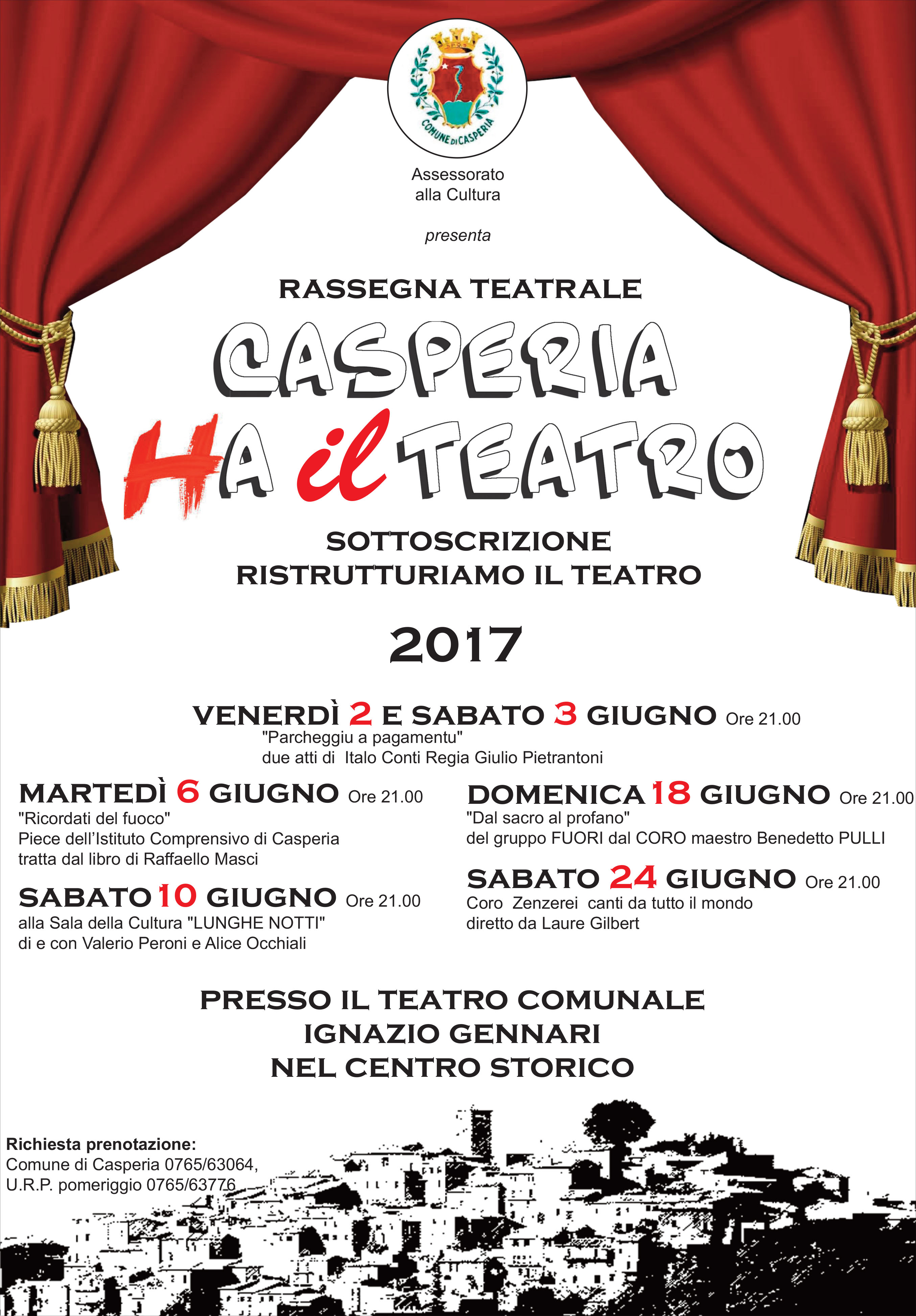 Secondo anno della rassegna teatrale “Casperia ha teatro” ma quest’anno aggiungiamo l’articolo determinativo singolare “il” perché finalmente è possibile tornare ad usufruire della vera e propria struttura in cima al borgo. Apre la rassegna il teatro dialettale dell’Aspra Folk con uno spettacolo che tanto è piaciuto nella scorsa esibizione, passando al teatro d’autore come la pièce dell’Istituto comprensivo di Casperia, tratta dal libro di Raffaello Masci“Ricordati del fuoco”, e la commedia delle residenze teatrali – che, per ragioni di spazio, si svolgerà nella sala del Palazzo della Cultura, in via Garibaldi – fino ai cori del gruppo Fuori dal Coro e Zenzerei.