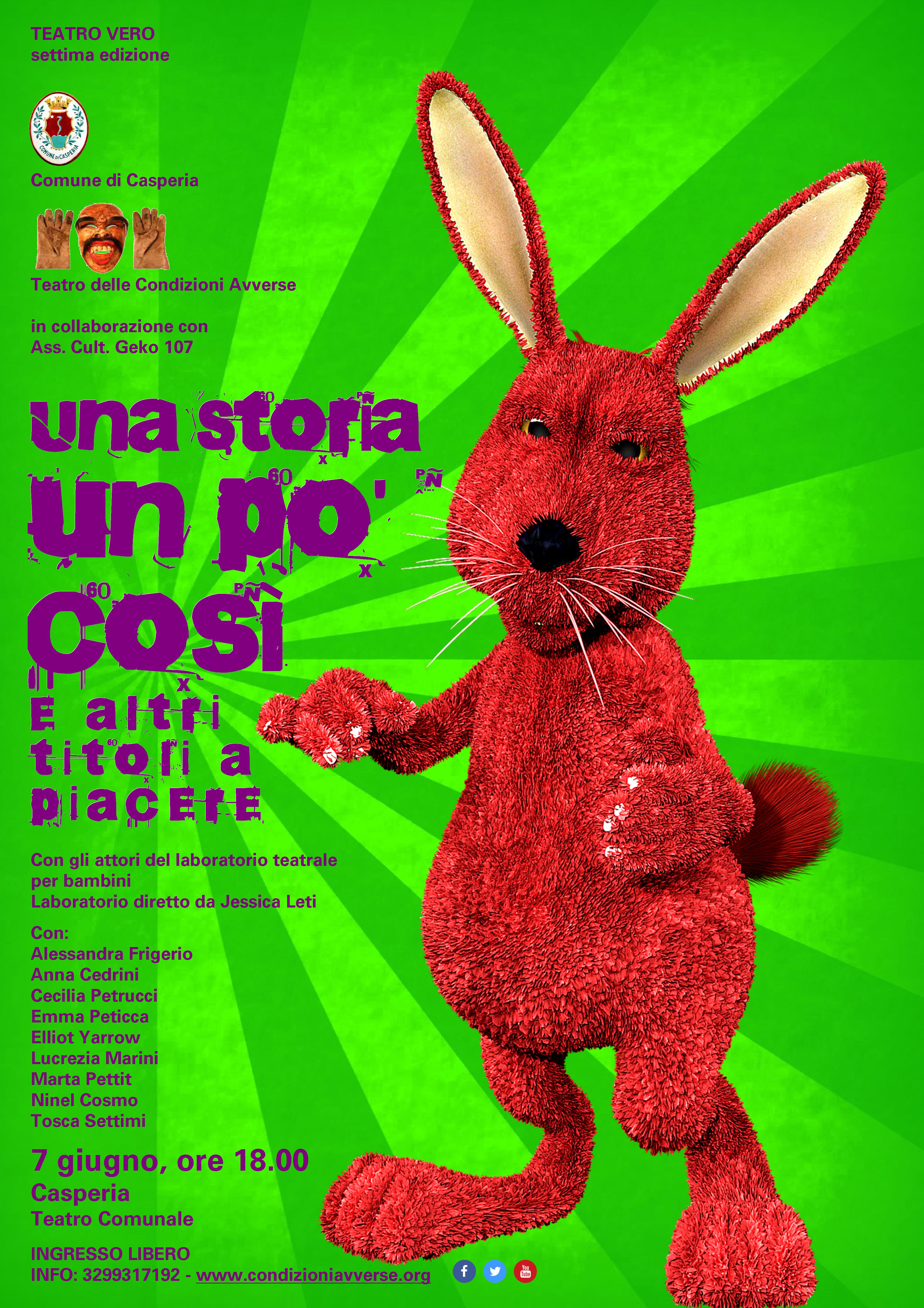 Vi aspettiamo il 7 Giugno alle ore 18.00 al Teatro Comunale di Casperia “I. Gennari”, per lo spettacolo conclusivo del percorso laboratoriale di teatro stagione 2017/2018 con bambine, bambini e ragazzi di Casperia diretto dal Teatro delle Condizioni Avverse. La storia raccontata è stata inventata dai partecipanti al laboratorio. Ci saranno ninja, demoni, magiche bambine e bambine brontolone, pazzi nonni e uno strano coniglio.