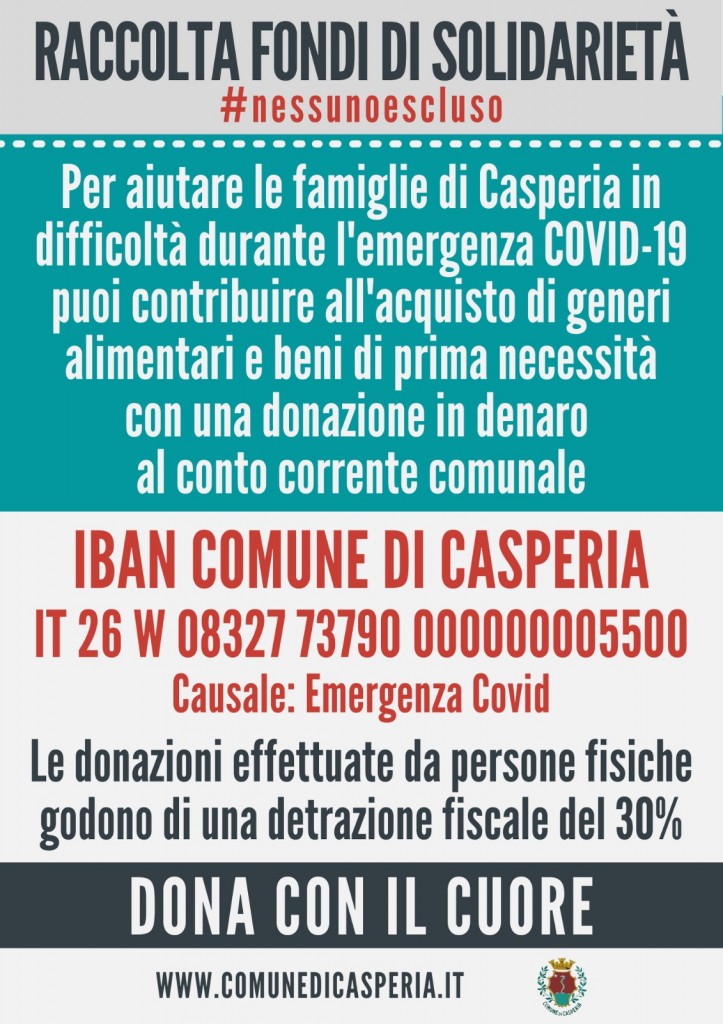 Per chi fosse impossibilitato ad acquistare direttamente beni primari da donare a sostegno delle famiglie più bisognose ma avesse comunque il desiderio di contribuire, è attiva una raccolta fondi comunale per la gestione della solidarietà alimentare. Il codice Iban del Comune di Casperia su cui effettuare la donazione e la causale sono indicati nell’infografica.