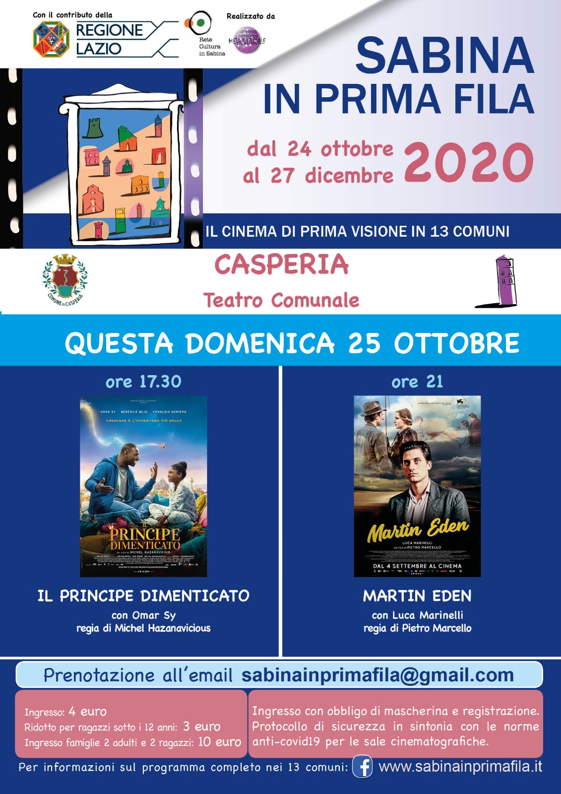 L’ingresso è fissato a 4 euro con un contributo ridotto a 3 euro per i ragazzi sotto i 12 anni. Agevolazioni per le famiglie. Mascherina e registrazione obbligatoria con la raccomandazione di prenotarsi tramite posta elettronica a sabinainprimafila@gmail.com. Indicare nell’e-mail nome e cognome della persona che prenota, titolo del film, comune, data e orario, numero di adulti e di ragazzi sotto i 12 anni che assisteranno allo spettacolo.