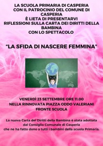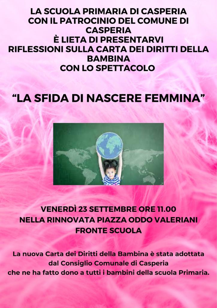 Venerdì 23 settembre, alle 11 in piazzale Oddo Valeriani, la scuola primaria di Casperia, con il patrocinio dell’Amministrazione comunale, presenta delle riflessioni sulla Carta dei diritti della bambina con lo spettacolo La sfida di nascere femmina.