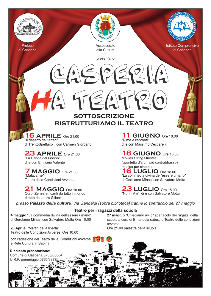 Su iniziativa dell’Assessorato alla Cultura, Turismo e Ambiente di questo Ente ha avuto inizio il programma teatrale per l’anno 2016 dal titolo “Casperia ha Teatro” nella sua prima edizione. L’iniziativa realizzata con la collaborazione dell’Associazione Pro Loco di Casperia, nonché la partecipazione condivisa dell’Istituto Comprensivo Scolastico di Casperia, il gruppo teatrale Condizioni Avverse, gruppo studio teatrale di Gerolamo Minasi e i gruppi orchestrali di Carla Tutino e le Zenzere, prevede una serie di appuntamenti teatrali al fine di dare spazio e condividere un progetto che promuove la cultura e il teatro nel territorio comunale, mantenendo vivi e alimentando i fermenti artistici e culturali della Comunità. Continue reading