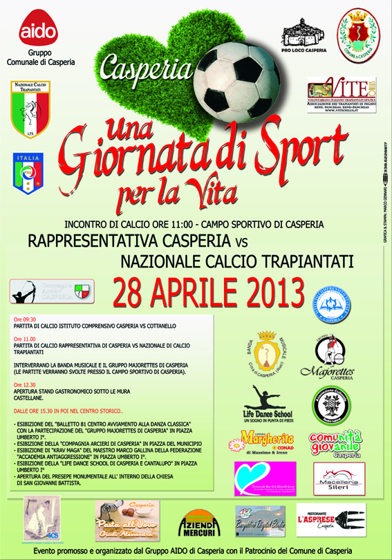 Il gruppo comunale Aido di Casperia, con il patrocinio dell’Amministrazione comunale, ha organizzato una manifestazione intitolata Una giornata di sport per la vita che si terrà a Casperia domenica 28 aprile. L’evento ha lo scopo di sensibilizzare la popolazione alla cultura del dono ed alla solidarietà partecipata. Continue reading