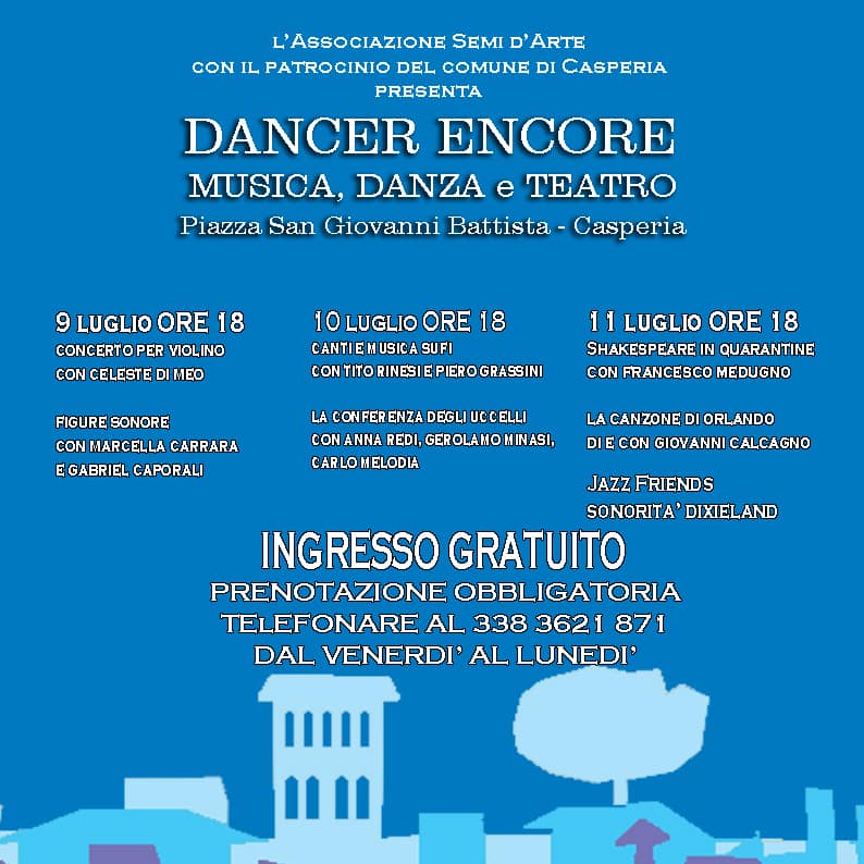 Ancora un weekend culturale a #Casperia, questa volta a cura dell’associazione Semi d’Arte: venerdì 9, sabato 10 e domenica 11 luglio, in Piazza San Giovanni Battista, si terrà la manifestazione “Dancer encore”, una tre giorni di esibizioni artistiche che spazieranno dalla musica, alla danza fino al teatro.