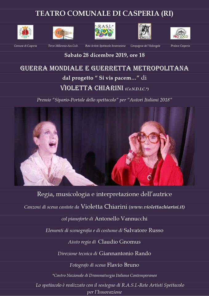 Sabato 28 dicembre alle ore 18 a Casperia, al teatro comunale “Ignazio Gennari”, avrà luogo la rappresentazione di “Guerra Mondiale e guerretta metropolitana”, di Violetta Chiarini, che ne è anche la regista e l’interprete. Lo spettacolo fa parte del progetto “Si vis pacem…” della stessa Chiarini ed è realizzato col sostegno di R.A.S.I.-Rete Artisti Spettacolo per l’Innovazione. Si avvale, inoltre, del patrocinio del Comune e della Pro Loco di Casperia. Il testo ha vinto il Premio Sipario – Portale dello Spettacolo nel concorso Autori Italiani 2018, è pubblicato in Sipario Europa 2019 - con sinossi in cinque lingue e distribuzione internazionale – e in Arte e Scienza del giugno 2019. Si tratta di uno spettacolo che svolge il tema della guerra e della pace in una prospettiva nuova, dove la figura della donna, sempre più protagonista del ventunesimo secolo, diventa la chiave di volta per la formazione della futura umanità. E’ diviso in due parti precedute da un prologo: nella prima parte, che è drammatica, l’azione si svolge in piena guerra mondiale nell’autunno 1943, mentre nella seconda parte, che è comico-umoristica, ancorché amarognola, Violetta Chiarini ripropone un suo personaggio radiofonico di successo, alle prese con la vita violenta e stressante della Roma 1997, rappresentando una sorta di affresco satirico della Capitale. La scrittura di questa seconda parte dello spettacolo è un recupero di antichi linguaggi osco-umbro-sabelli, per valorizzare le parlate locali, alimento dell’italiano, che vanno scomparendo. «Guerra mondiale e guerretta metropolitana – dice la Chiarini – mette sullo stesso piano due forme di violenza che sembrano distanti tra loro, ma non lo sono, perché hanno la stessa matrice nell’incapacità di creare armonia e pace. Guerra e guerretta nascono dentro il cuore dell’essere umano ed è lì che si deve fare la rivoluzione. Il detto latino “Si vis pacem, para bellum” va capovolto: oggi dobbiamo dire “Si vis pacem, para pacem”.»