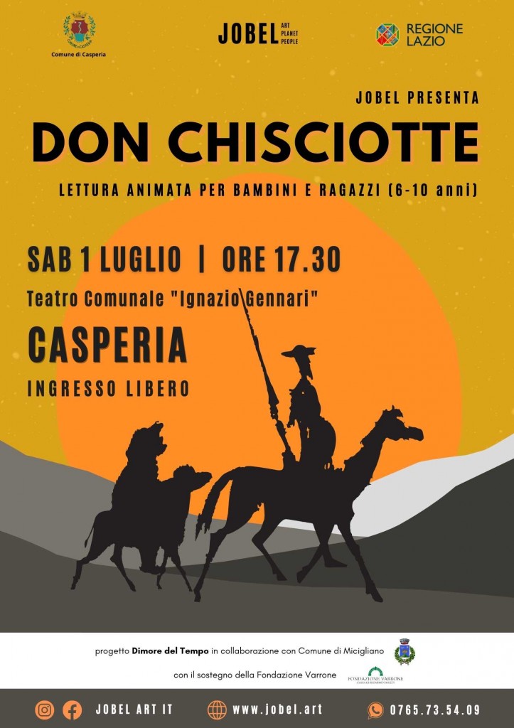 Il primo appuntamento, sabato primo luglio alle ore 17.30 presso il teatro comunale Ignazio Gennari, sarà dedicato ai bambini con Don Chisciotte, L’avventura di un uomo che trasformò il suo sogno in realtà. La lettura animata porterà i bambini alla scoperta delle peripezie del cavaliere della Mancia e del suo fedele scudiero Sancho Panza. La lettura racconta la storica tenacia di un sognatore che non ha ceduto ai dettami della società e ha combattuto per i propri ideali con forza, purezza e ingenuità.