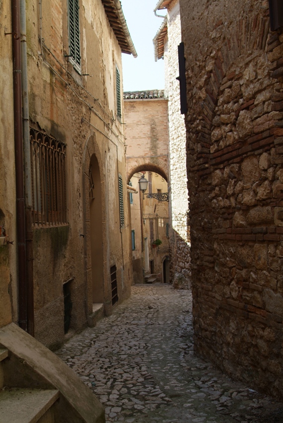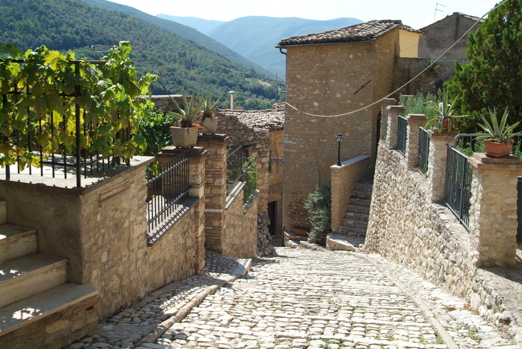 L’abitato è raccolto nelle mura del 1282 – definite da Giuseppe Filippucci Giustiniani «un vero capolavoro di architettura militare e di consumata arte difensiva del XIII secolo» – in cui si può accedere (esclusivamente a piedi) solo attraverso Porta Romana (ad ovest) e Porta di S. Maria (a nord-est); su quest’ultima, detta anche Porta Reatina, si può ammirare un orologio che segna l’ora canonica medievale. Della prima cinta muraria, risalente all’XI secolo, resta l’arco di via Garibaldi, denominato «Arco Vecchio» o «Arco di Mezzo».