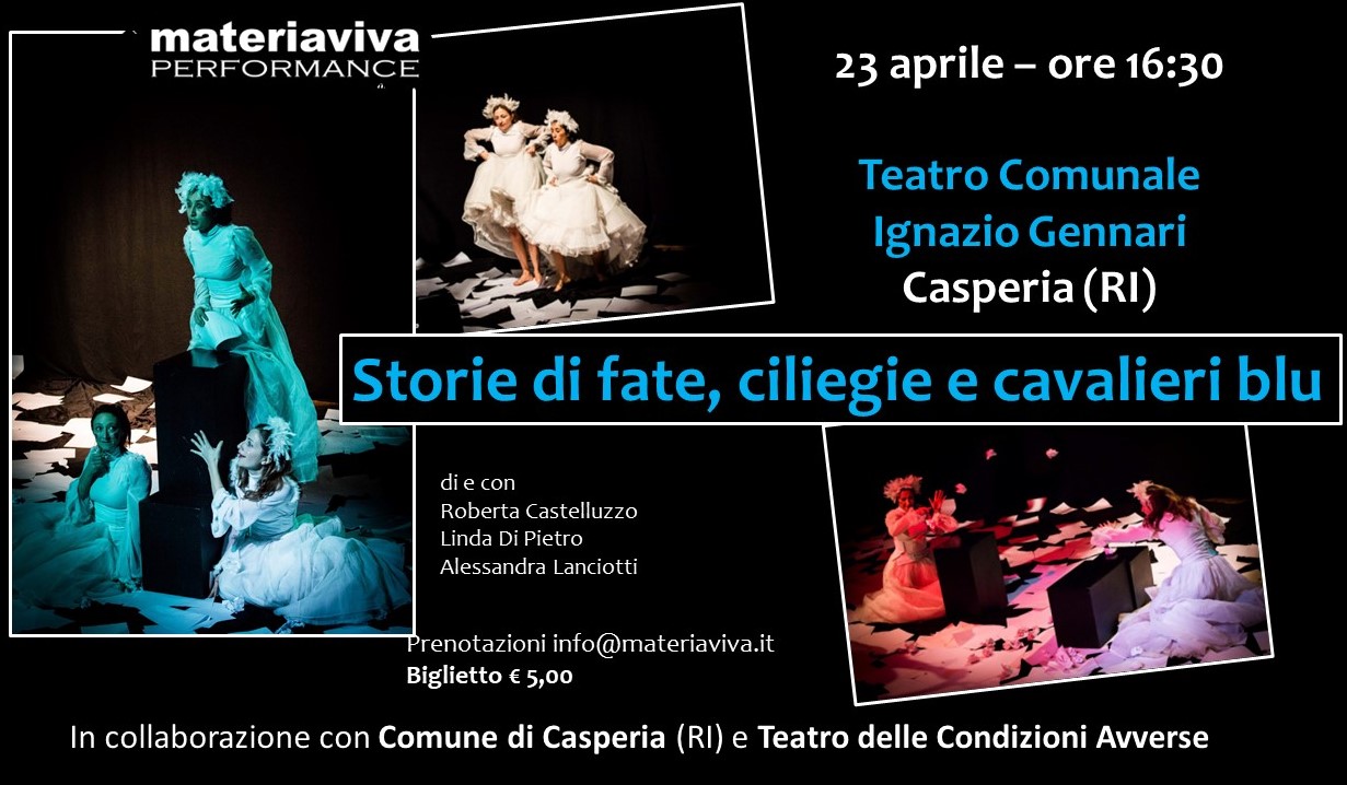 Domenica 23 aprile 2023 alle ore 16.30 la compagnia Materiaviva Performance porterà in scena, al teatro comunale Ignazio Gennari, lo spettacolo per bambini e famiglie “Storie di fate, ciliegie e cavalieri blu”.