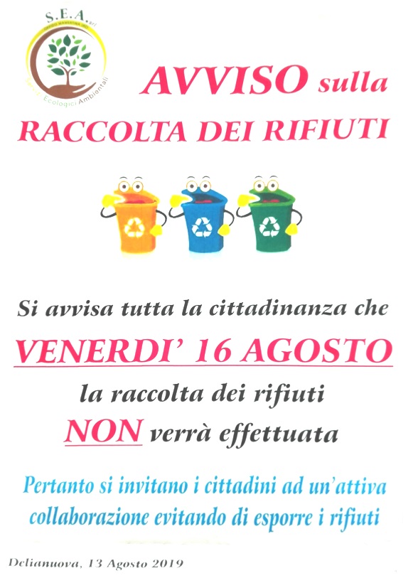 Il Comune avvisa tutta la cittadinanza che giorno 16 Agosto 2019 la raccolta rifiuti NON verrà effettuata.Si invitano pertanto i cittadini ad un'attiva collaborazione evitando di esporre i rifiuti.