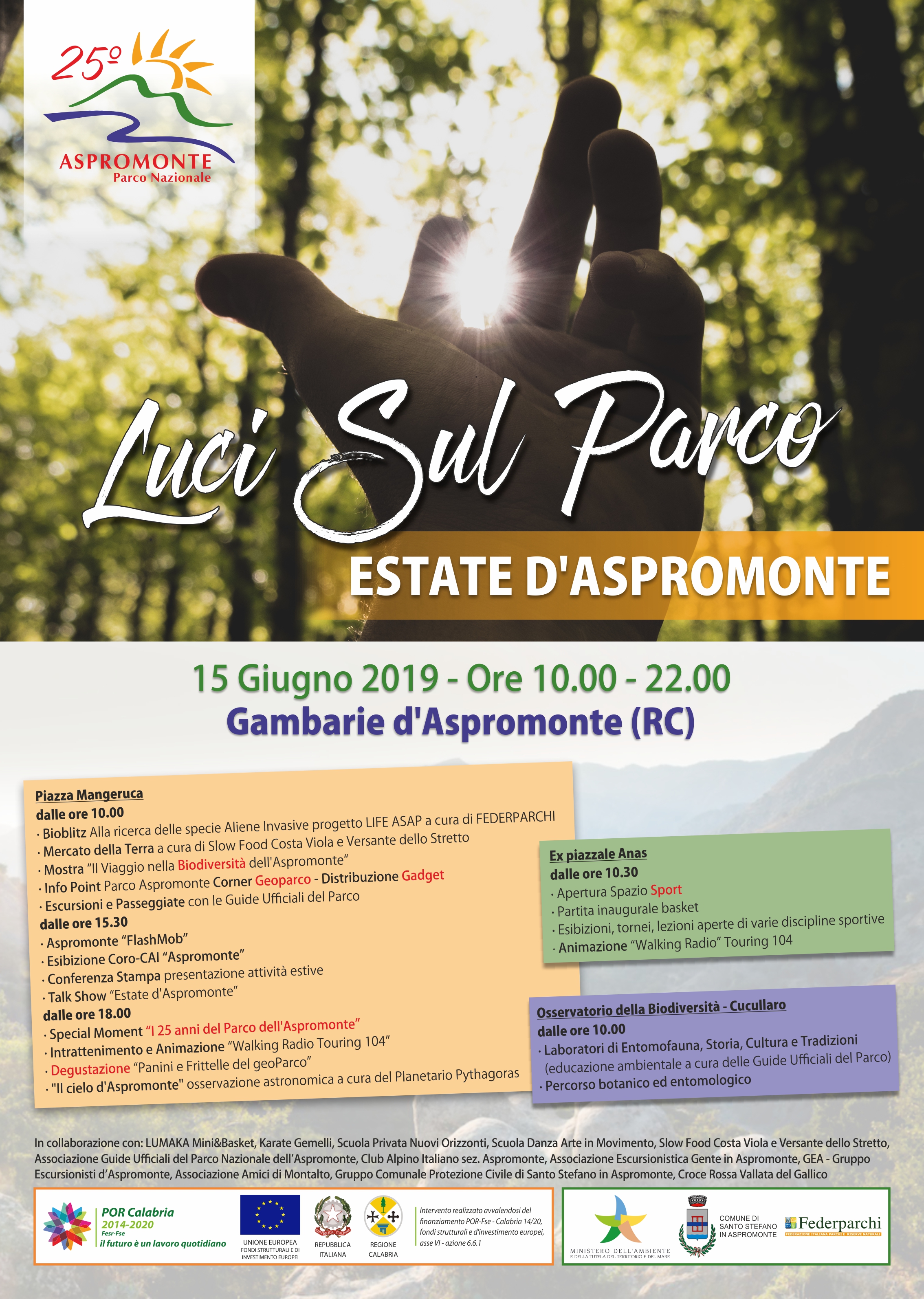 Stampa Condividi Facebook Twitter Whatsapp Telegram Email 12/06/2019 - Ente Parco nazionale d'Aspromonte Luci sul Parco Documentazione disponibile in allegato: Locandina Attachments: Programma_Luci_sul_parco_locandina__fin.jpg[ ]3269 kB Pubblicato: 12 Giugno 2019 Ultima modifica: 21 Giugno 2021 Visite: 1617