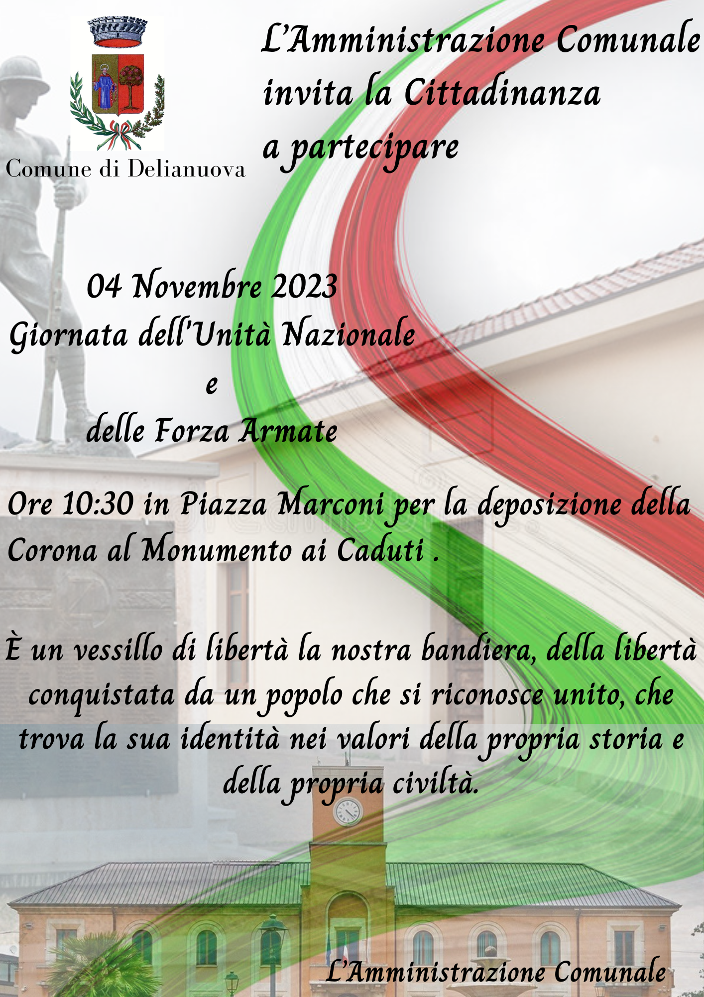 Stampa Condividi Facebook Twitter Whatsapp Telegram Email 04 novembre 2023 Giornata dell'Unita' Nazionale e delle Forze Armate Attachments: Il 4 novembre.png[ ]3038 kB Pubblicato: 31 Ottobre 2023 Ultima modifica: 31 Ottobre 2023 Visite: 633