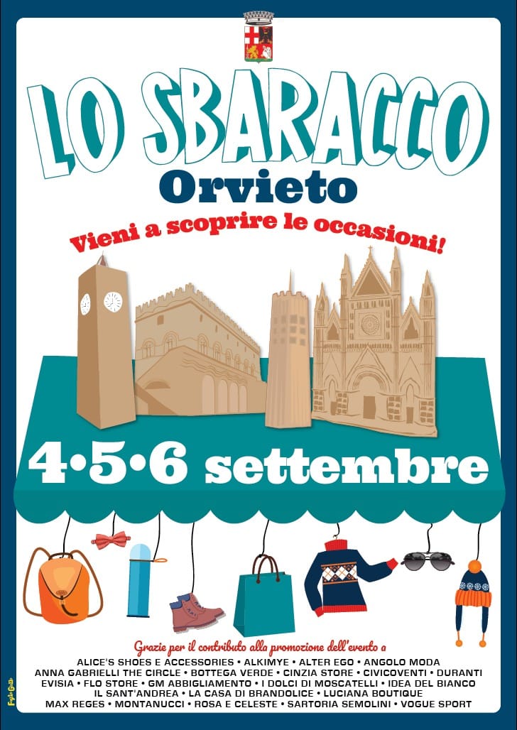 (ON/AF) – ORVIETO – Per iniziativa dei commercianti e con la collaborazione del Comune, Venerdì 4, Sabato 5 e Domenica 6 settembre 2020 si terrà ad Orvieto la 2^ edizione dell’iniziativa “Lo Sbaracco”, quale opportunità di rilancio e valorizzazione del settore commerciale e dell’immagine turistica della città.