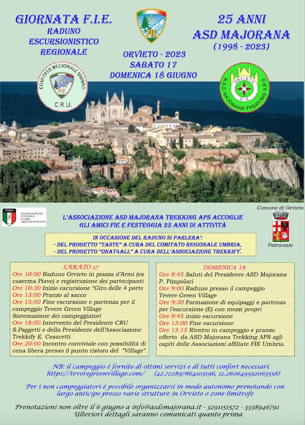 (COMUNICAZIONE) ORVIETO – Sabato 17 e domenica 18 giugno Orvieto e il suo territorio ospitano il raduno regionale della Federazione italiana escursionismo dell’Umbria, organizzata in collaborazione con l’Asd Majorana Trekking che nell’occasione festeggerà i 25 anni di attività, e il patrocinio del Comune di Orvieto.