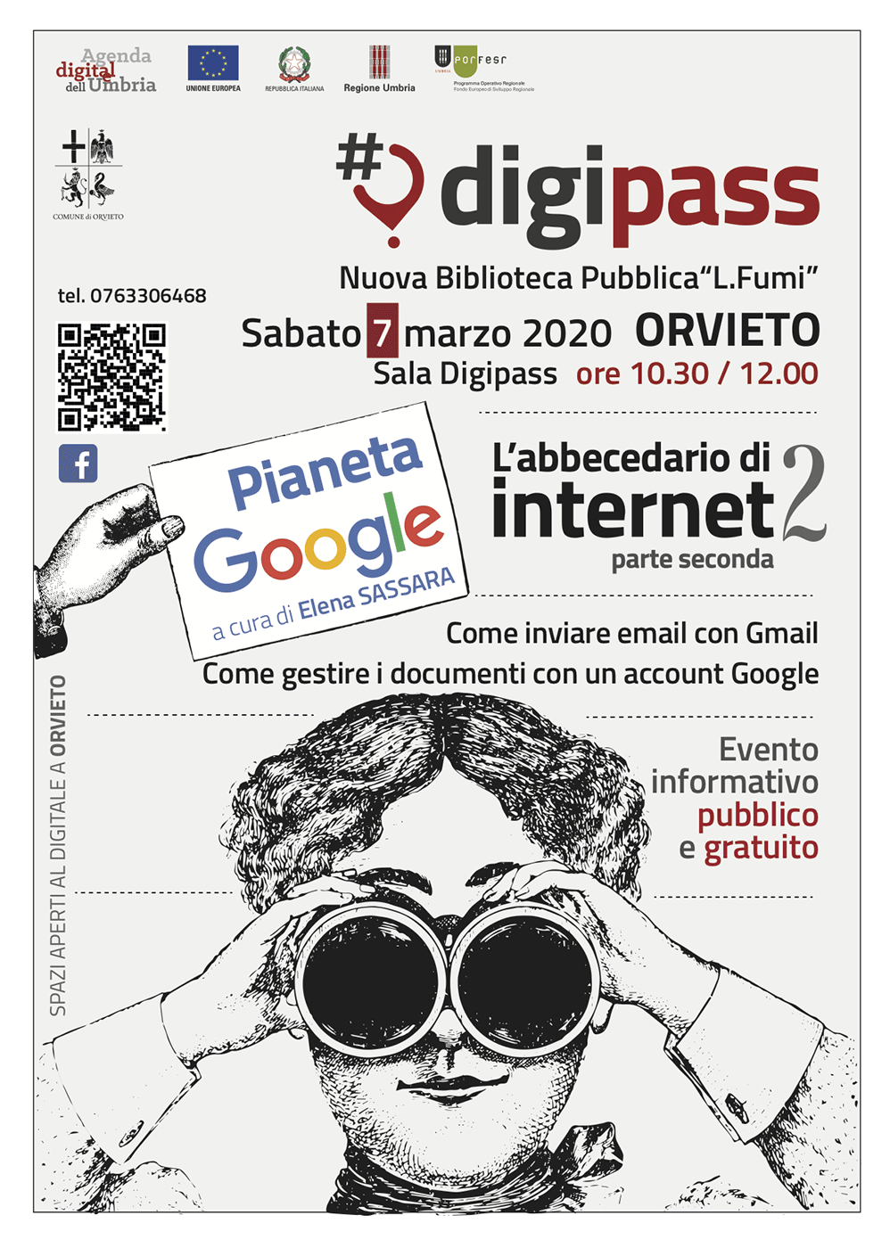 (ON/AF) – ORVIETO – Dopo la lezione sui metodi di interrogazione del più grande motore di ricerca del mondo web e di come fare un account di posta elettronica su Gmail, prosegue da parte del Digipass di Orvieto il ciclo dell’Abbecedario di Internet che sabato 7 marzo, dalle ore 10.30 alle 12.00 nella Sala Digipass presso la Nuova Biblioteca Pubblica “Luigi Fumi” – incontro pubblico e gratuito – propone la seconda lezione dedicata al “Pianeta Google” e il suo “ecosistema” fatto di servizi, opportunità e possibilità, conoscendone.