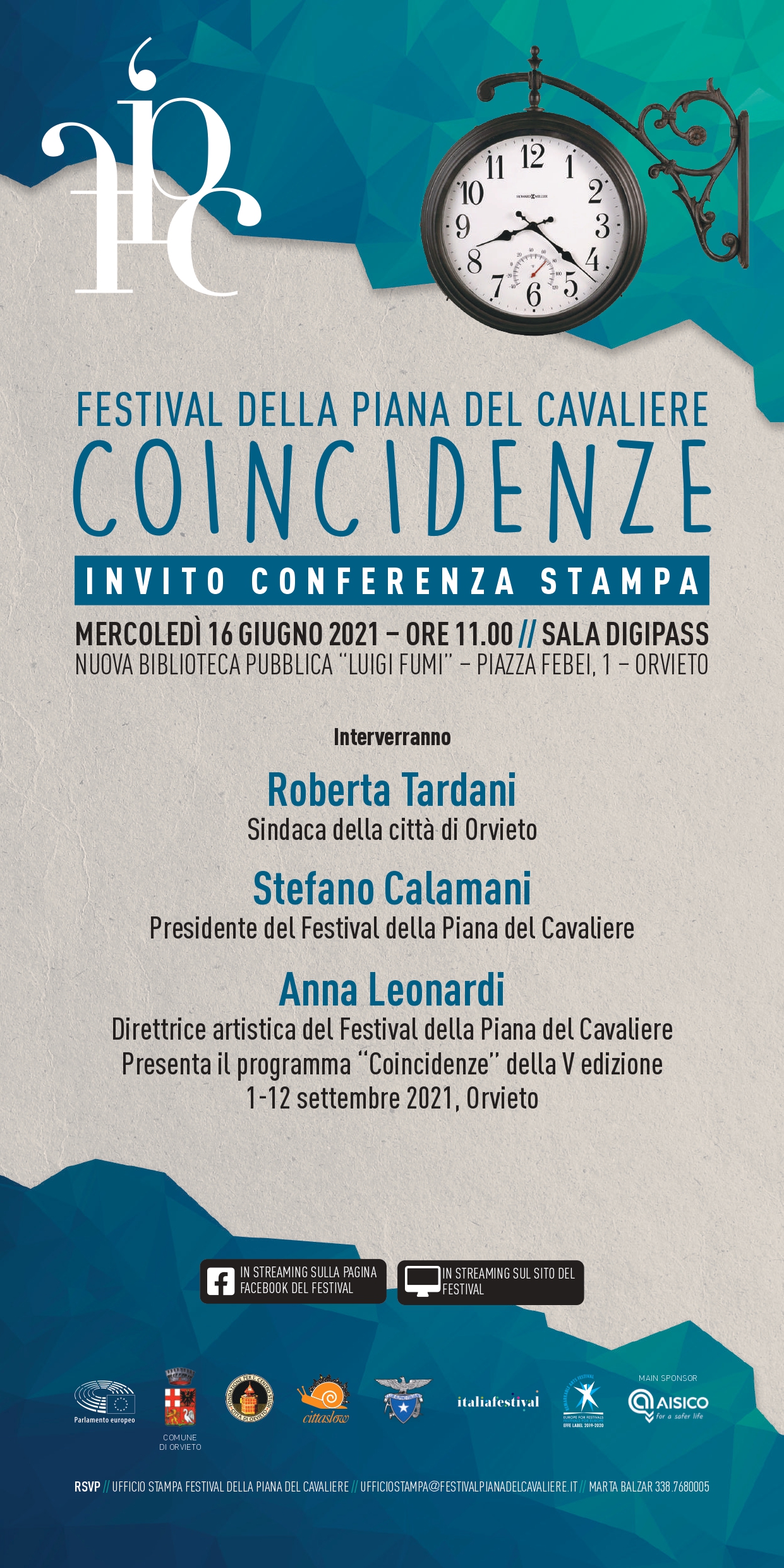 (ON/AF) – ORVIETO – Mercoledì 16 giugno alle ore 11 presso la Sala DigiPASS di Orvieto, spazio digitale della Biblioteca Pubblica “Luigi Fumi” di Orvieto, ospiterà la conferenza stampa di presentazione della V edizione del Festival della Piana del Cavaliere, rassegna estiva di eventi culturali, teatrali e di musica classica che inaugurerà questa nuova stagione per la prima volta in Umbria. Gli eventi, in cartellone dal 1° al 12 settembre 2021, si terranno in luoghi rappresentativi, come il Teatro Mancinelli e la piazza del Duomo.