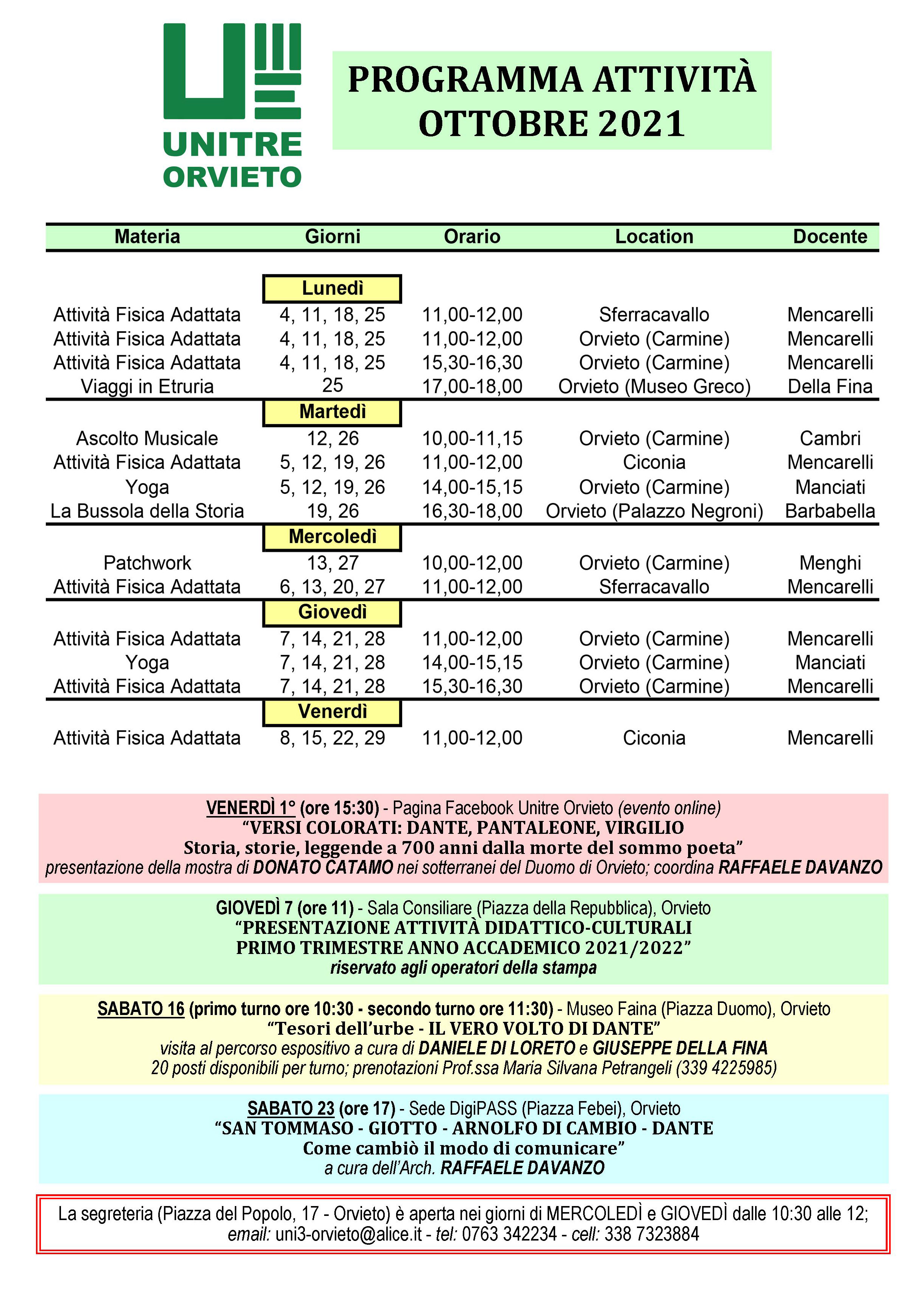 Giovedì 7 (ore 11): presso la Sala Consiliare del Comune di Orvieto, il Consiglio Direttivo dell’Unitre presenterà alla stampa le “Attività didattico-culturali del primo trimestre dell’Anno Accademico 2021/2022”. Appuntamento riservato agli operatori dell’informazione che successivamente sarà diffuso attraverso canali televisivi e online.