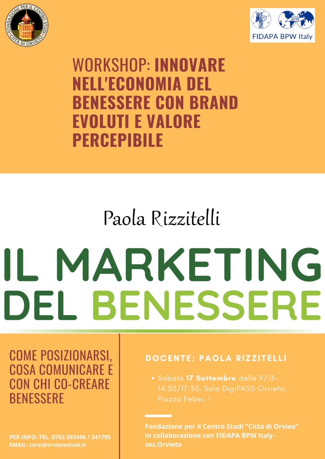 (ON/AF) – ORVIETO – Sono aperte le iscrizioni al Workshop “Innovare nell’Economia del Benessere con brand evoluti e valore percepibile. Come posizionarsi, cosa comunicare e con chi co-creare benessere”, organizzato dalla Fondazione per il Centro Studi Città di Orvieto in collaborazione con FIDAPA BPW Italy – Sezione di Orvieto che si terrà nella giornata di sabato 17 settembre dalle ore 9 alle 13 e dalle 14:30 alle 17:30, presso la Sala DigiPASS (in Piazza Febei, 1).