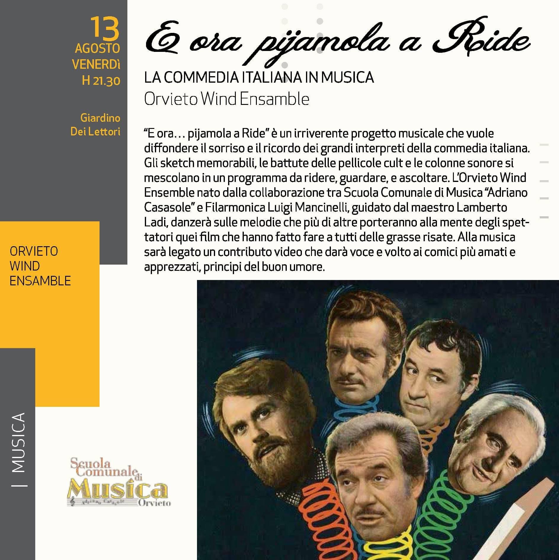 L’Orvieto Wind Ensemble nato dalla collaborazione tra Scuola Comunale di Musica “Adriano Casasole” e Filarmonica Luigi Mancinelli, guidato dal maestro Lamberto Ladi, danzerà sulle melodie che più di altre porteranno alla mente degli spettatori quei film che hanno fatto fare a tutti delle belle e grasse risate. Alla musica sarà legato un contributo video che darà voce e volto ai comici più amati e apprezzati, principi del buon umore, da Alberto Sordi a Ugo Tognazzi, Vittorio Gassman, Carlo Verdone, Bud Spencer, Terence Hill e molte altre figure simbolo della commedia italiana.