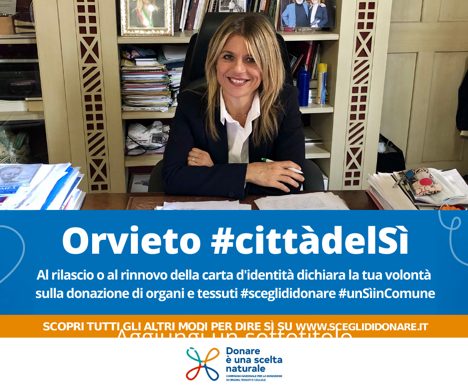 (ON/AF) – ORVIETO – Il Comune di Orvieto aderisce alla 25^ Giornata Nazionale della donazione di organi e tessuti che si terrà Domenica 24 aprile e alla campagna informativa e divulgativa promossa da ANCI trasmessa su tutti i principali media nazionali per promuovere la donazione attraverso i propri canali istituzionali (social e web).