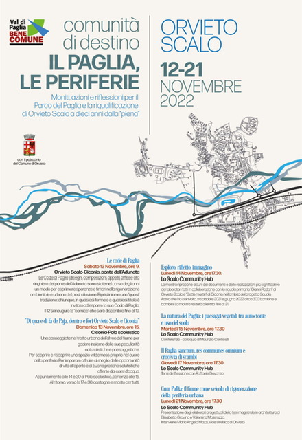 (ON/AF) – ORVIETO – Nel decimo anniversario della “grande piena” del 12 novembre 2012, per iniziativa dell’Associazione “Val di Paglia Bene Comune” e con il patrocinio del Comune di Orvieto da sabato 12 novembre al 21 ad Orvieto Scalo si torna a riflettere sulle persistenti problematiche circa l’uso del territorio e sullo sviluppo delle periferie urbane con il ciclo di appuntamenti intitolato “Comunità di destino. Il Paglia, le periferie. Moniti, azioni e riflessioni per il Parco del Paglia e la riqualificazione di Orvieto Scalo”.