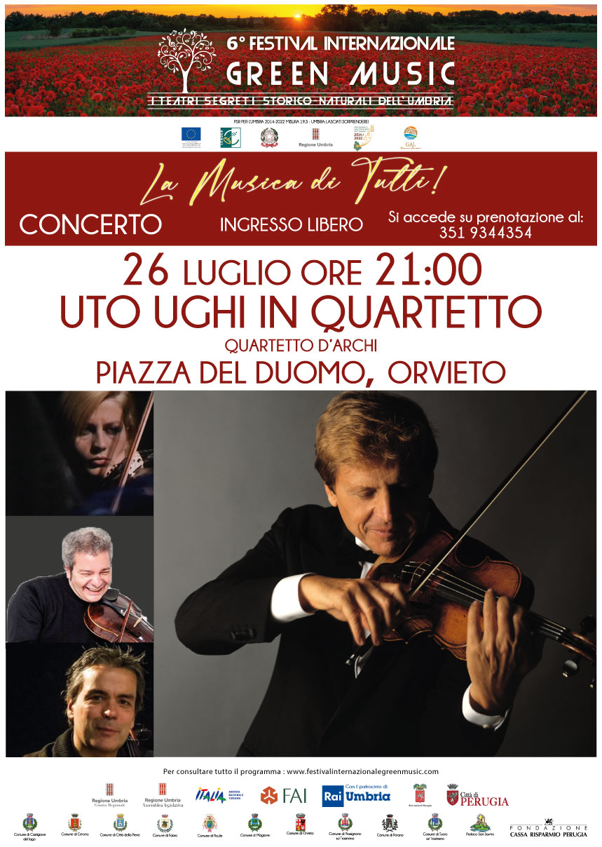 CONCERTO A ORVIETO del M° UTO UGHI in quartetto per il 6° Festival Internazionale Green Music. Martedì 26 Luglio ore 21 in Piazza Duomo