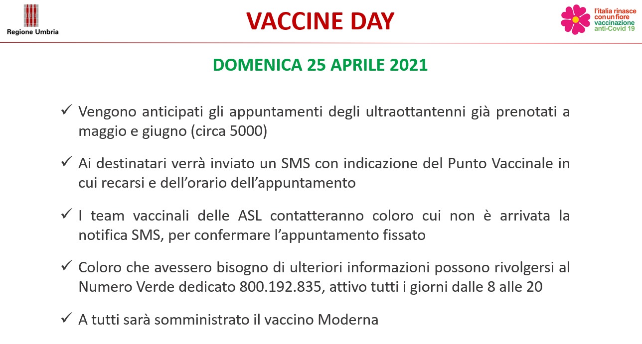 Ma “l’Umbria punta all’incremento del numero delle vaccinazioni e programma un Vaccine Day per domenica 25 aprile quando saranno anticipate le vaccinazioni di 5000 ultraottantenni prenotati per maggio e giugno. Si somministrerà il vaccino Moderna e gli appuntamenti verranno dati nel distretto sanitario di residenza. L’obiettivo è accelerare la vaccinazione degli over 80 e della popolazione a rischio. Di seguito, con la vaccinazione delle categorie produttive, si potrà far ripartire l’economia”.